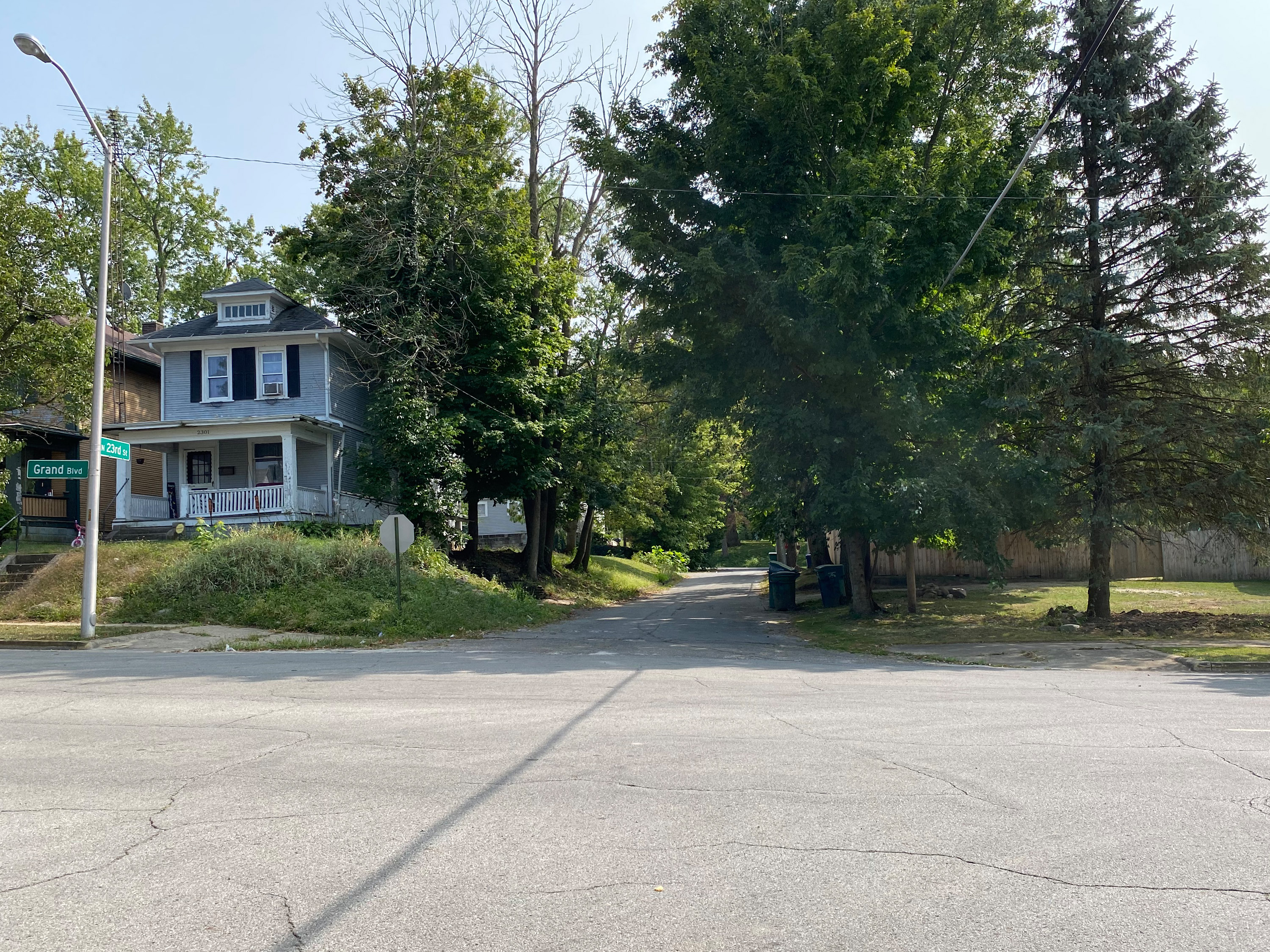 Dayton & Western Richmond freight bypass route on 23rd Street, looking south across Grand Boulevard. The bypass was built through Glen Miller Park in 1909 to get freight cars off of Main Street. It turned from 23rd to the right onto Grand which becomes N E Street in a couple of blocks. The cracks in the street and oil stains appear to show buried tracks but they are just coincidental. There is a report that residents petitioned to have the tracks removed from the park and by 1913 they were torn up. What happened after that is unclear. There does not appear to be any evidence of tracks or grading in the park either. The local street railway ran along here as well, with a track into Glen Miller Park, but sticking to the north side along the Pennsylvania Railroad's tracks. They had a small terminal just east of the pond to provide service for workers at the large railroad yard north of the park.