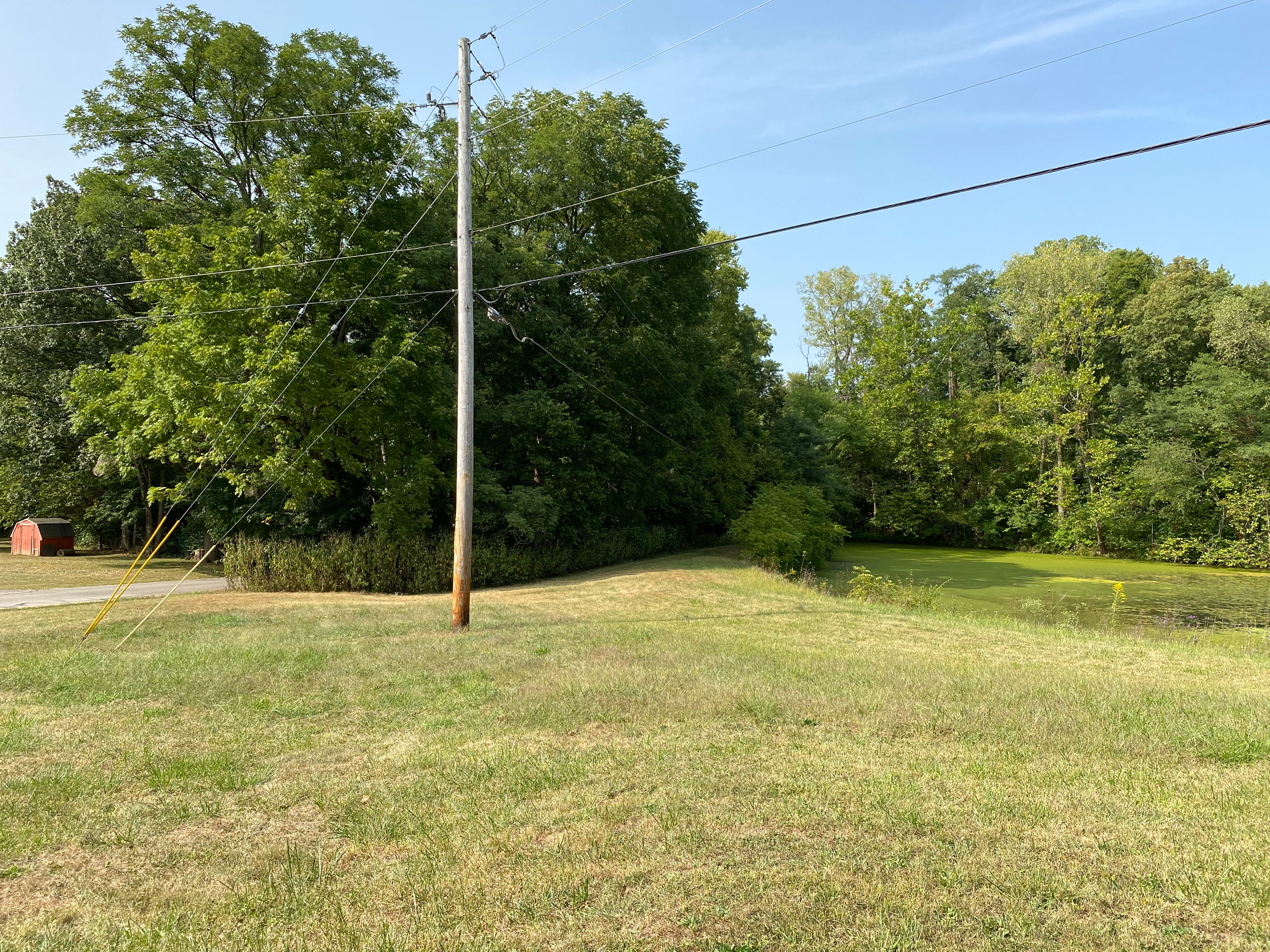 Location of the Dayton & Western's Cedar Springs stop on the New Paris branch, looking north from Cedar Springs Road. The shelter building from the previous historic photo would've been a little to the right at the edge of the pond. The trackbed was used as a dam to create this little pond. The photographer from the previous historic photo would've been up on the hill in the trees to the right.