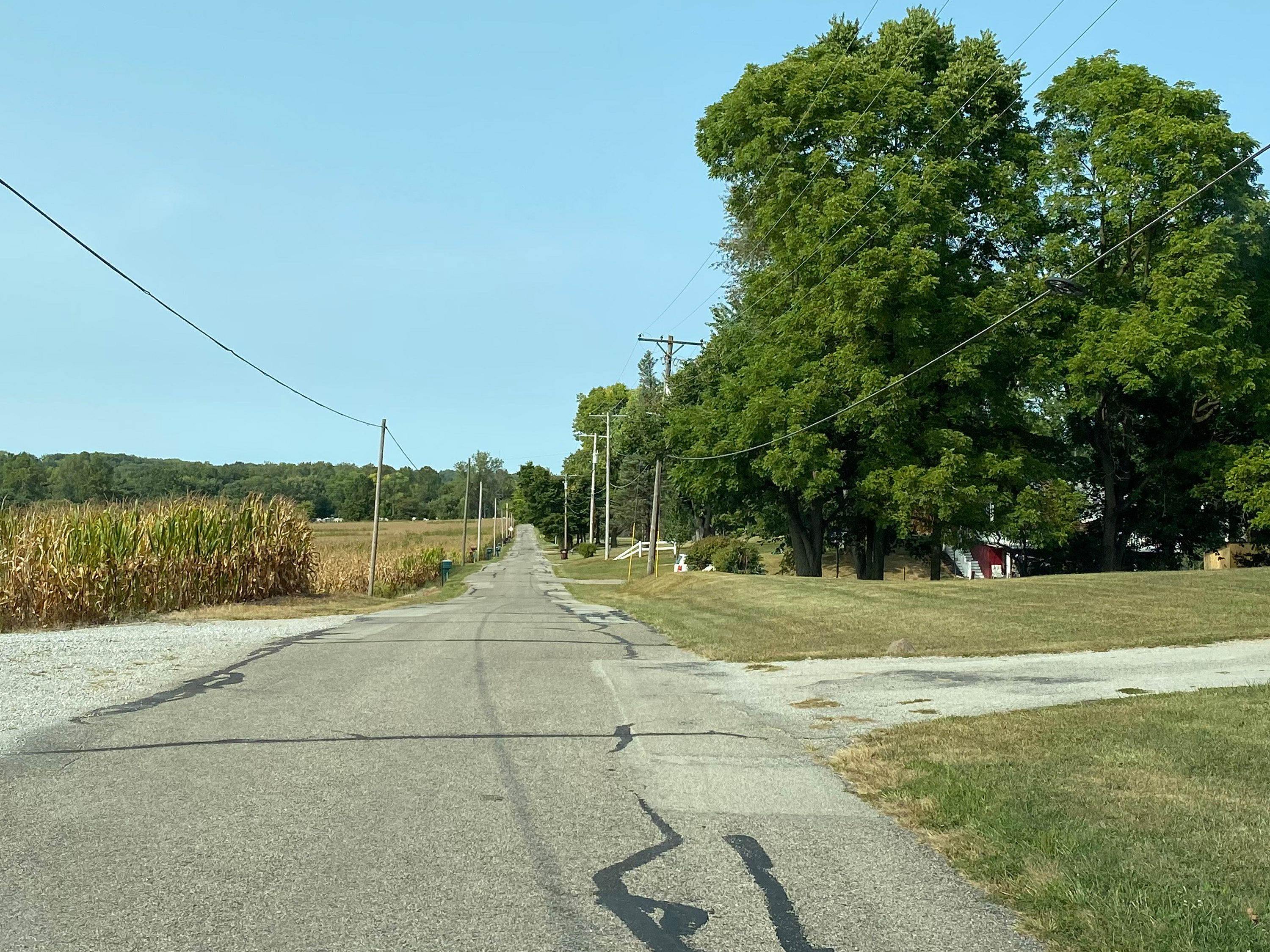 Dayton & Western New Paris Branch along Cedar Springs Road, looking north. There's a row of ranch houses to the right. Note the berm/grading that ends at the next driveway. When the houses were built it looks like the grading was flattened out.