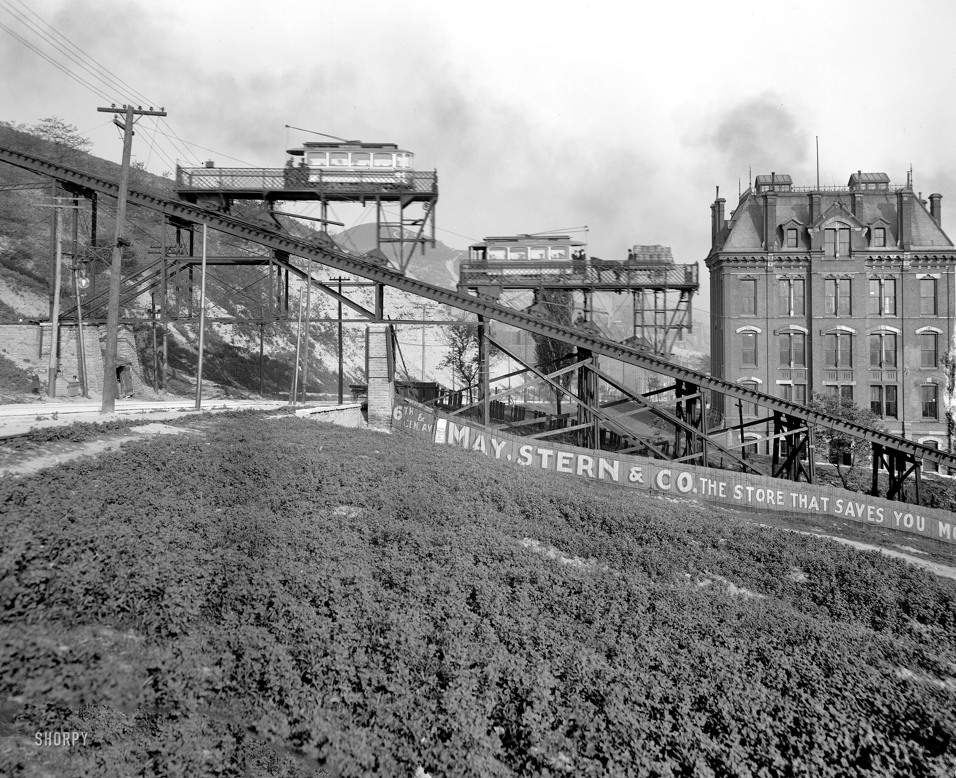 Historic photo of the Bellevue Incline around the turn of the 20th century, looking southeast along Clifton Avenue towards Vine Street. Original photo from the Library of Congress, restored by Shorpy.