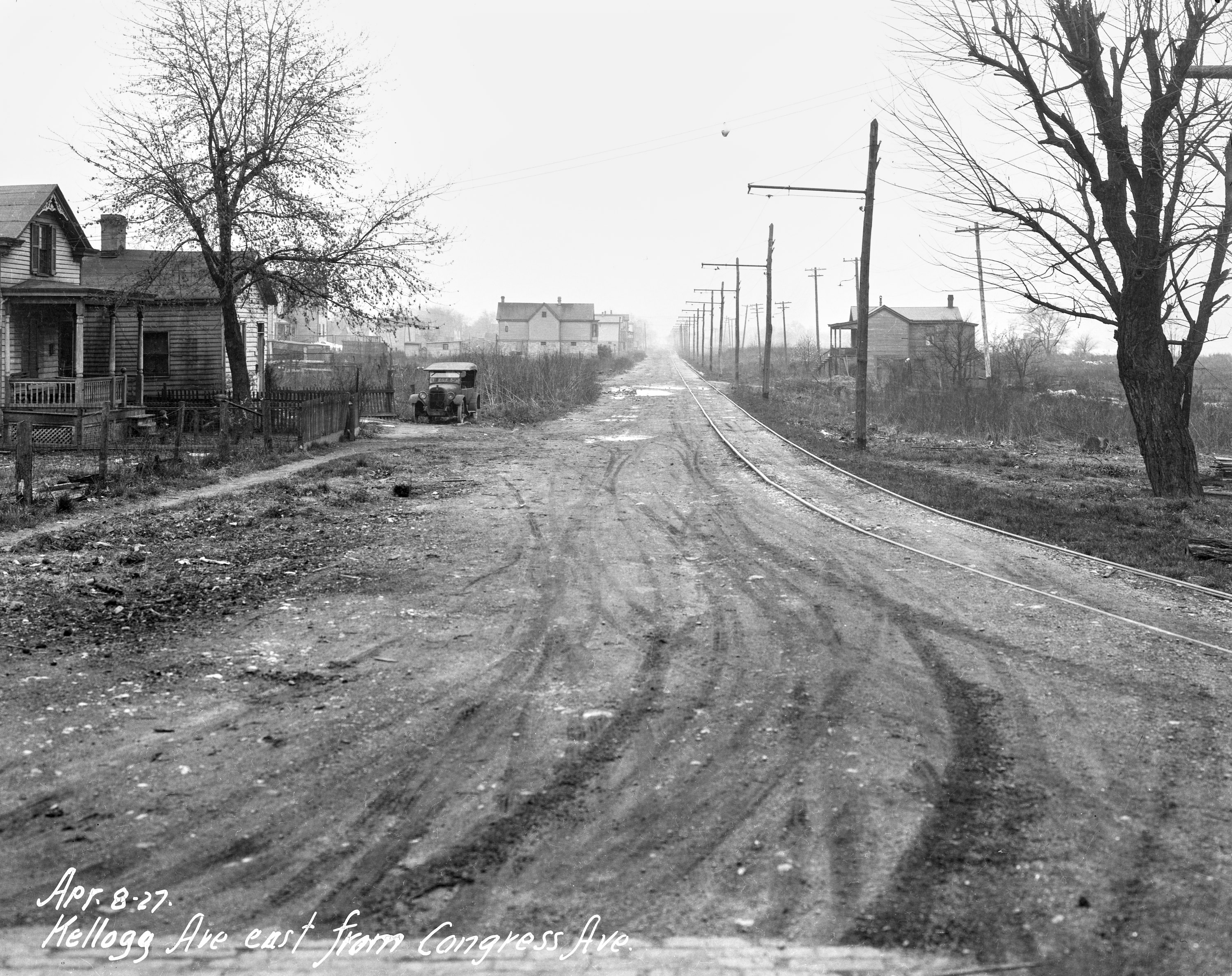 Historic photo of the CG&P on Kellogg Avenue in Columbia-Tusculum, looking southeast from Congress Avenue. Kellogg used to end at Congress Avenue, and there was a building directly in line with this side of Kellogg behind the vantage point of this photo. Thus, the track had to swing to the right to go around that building onto a short one-block private right-of-way for the track to get to Stanley from this point. The IR&T originally ran here to Stanley after removal of the Donham Avenue Viaduct in 1917, sharing tracks with the CG&P. It appears that the original street may actually have been to the right of the tracks and pole line, since there is a second line of poles with street lights. Perhaps that area was impassible for other vehicles due to the tracks and their eventual removal. From the University of Cincinnati Library Digital Resource Commons, Street Construction and Improvements collection.