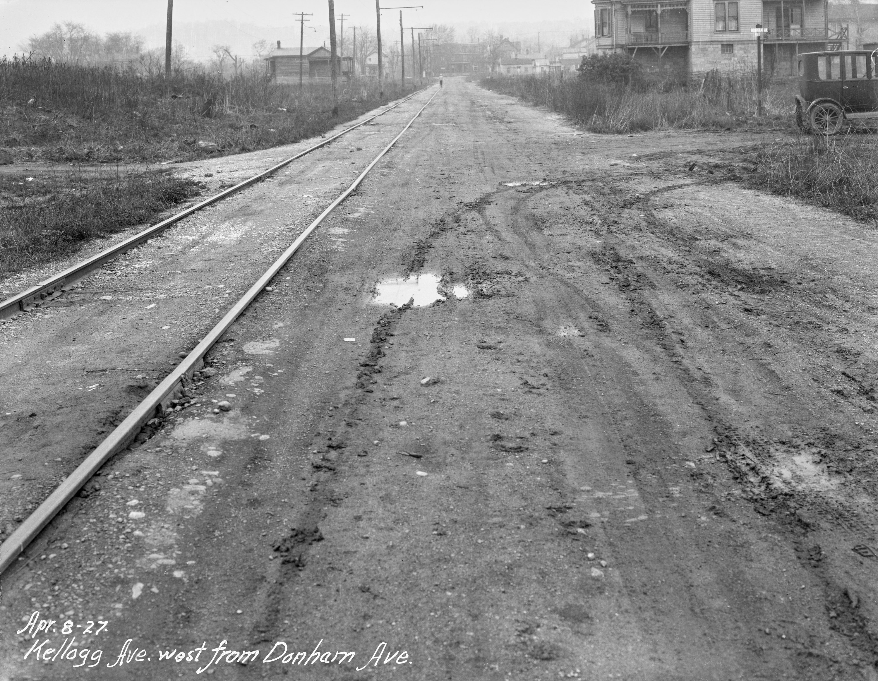 Historic photo of the CG&P on Kellogg Avenue in Columbia-Tusculum, looking northwest from Donham Avenue. The car at the top right is parked on Donham Avenue, although the viaduct originally came onto Kellogg slightly behind the vantage point of this photo. It had been removed 10 years prior. After abandonment of the IR&T in 1922, the CG&P had to build their own tracks in the street to get to the new terminal location at Stanley Avenue which opened in 1924. The building mentioned a few shots back at Congress, which the CG&P had to swing around, can be seen in the distance. From the University of Cincinnati Library Digital Resource Commons, Street Construction and Improvements collection.