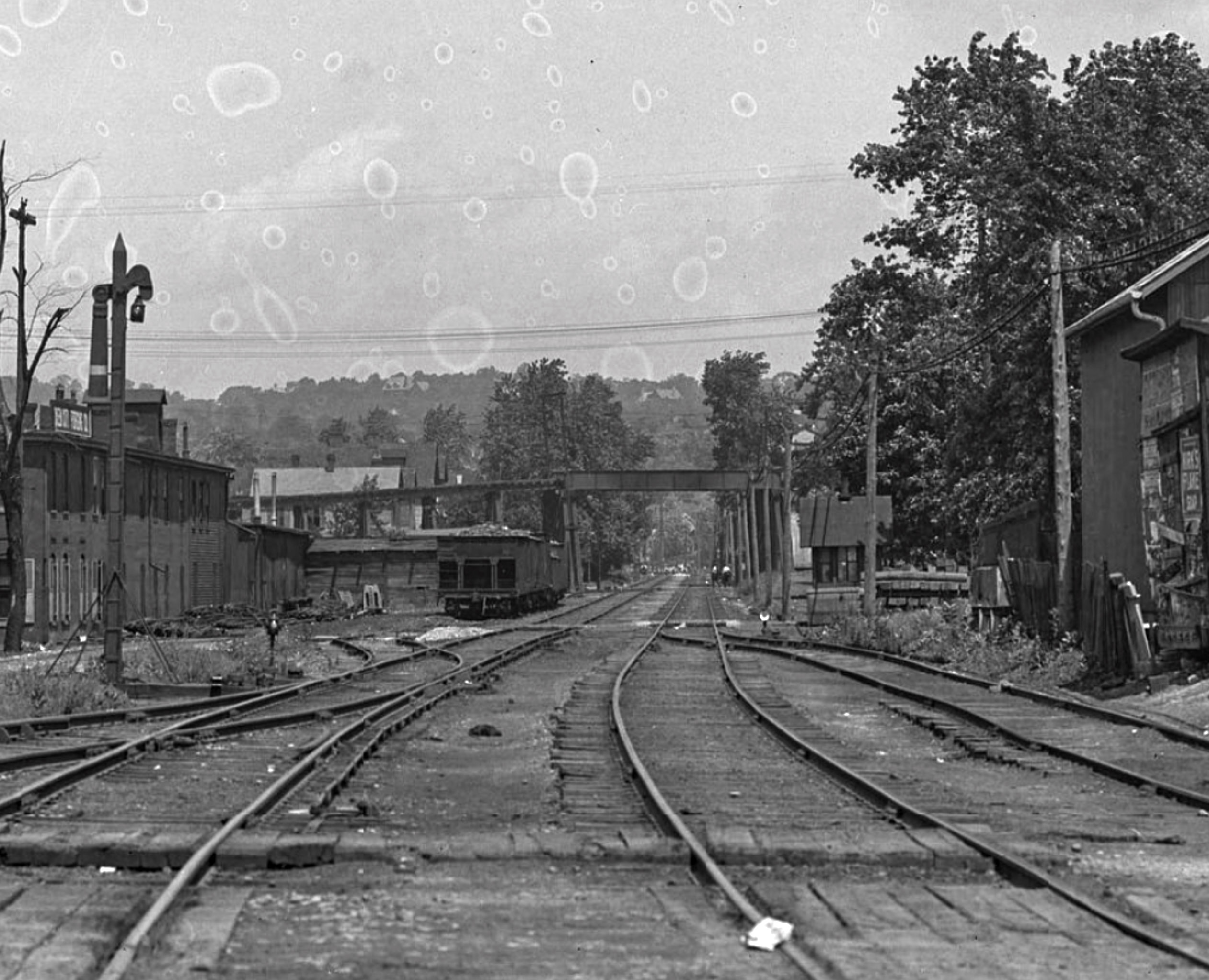 Close-up view of the previous view of the Pennsylvania/Little Miami Railroad and CG&P connection at McCullough Street in Columbia-Tusculum.