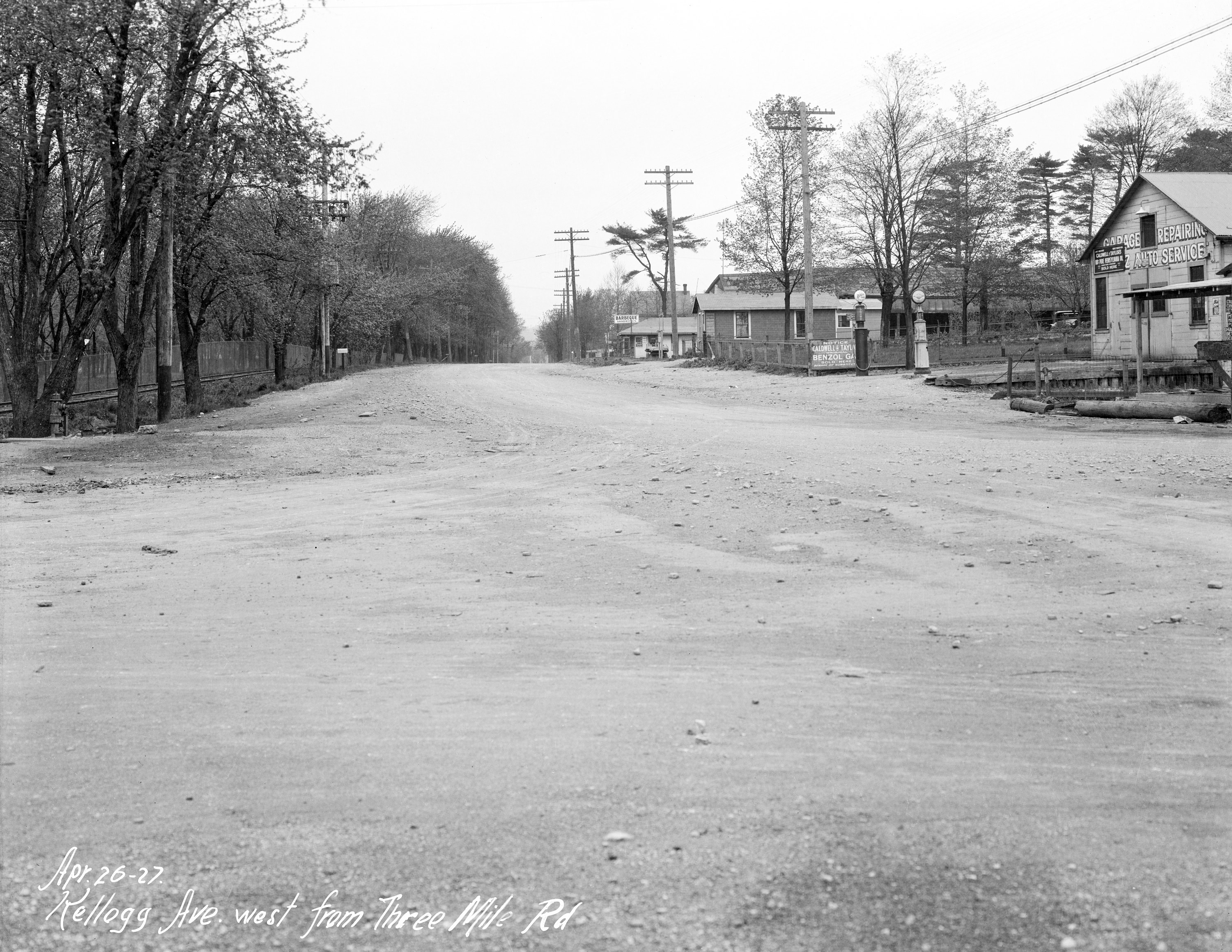 Historic photo of CG&P tracks from 1925 to the side of Kellogg Avenue and the abandoned IR&T carbarn at Sutton Road in front of Coney Island, looking northwest from the Coney Island entrance just three months before abandonment of the California branch east of the waterworks. The CG&P tracks next to the fence are where the entrance ramp to the park is now. The collapsing IR&T car barn is the long building behind the gas pumps at the right. From the University of Cincinnati Library Digital Resource Commons, Street Construction and Improvements collection.