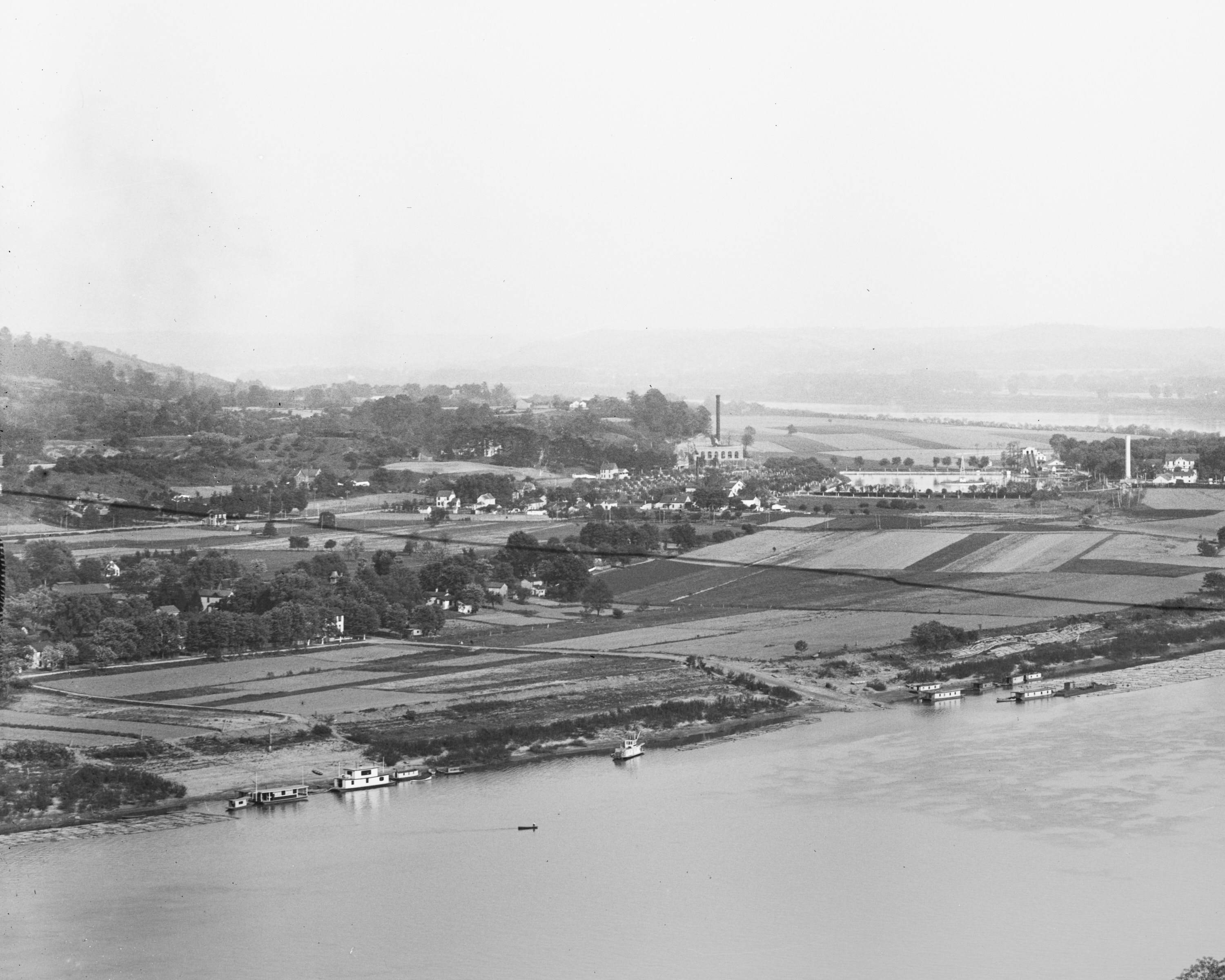 Historic photo of California and Coney Island as seen from Ft. Thomas, KY, looking southeast. The CG&P branch to Coney with its pairs of electrical poles can be seen snaking its way to the west gate (at the white smokestack at the right). The building near the middle with the black smokestack is the power house of the IR&T.