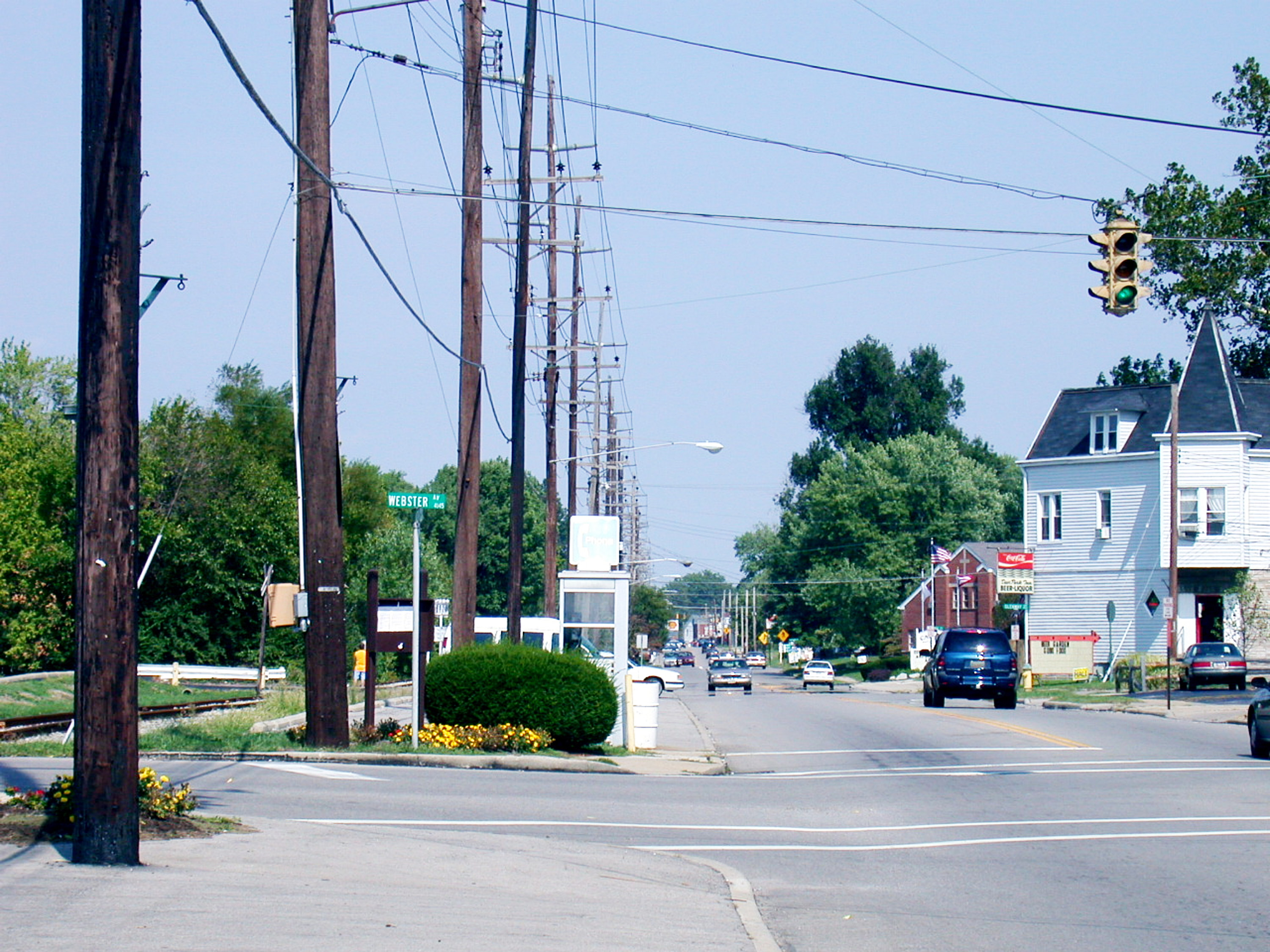 IR&T Rapid Railway right-of-way along Blue Ash Road, looking north across Webster Avenue in Deer Park. This line ran to the side of the road along the power lines. The CL&N (now I&O) is visible at left. Also note the old-style stoplight, which looks like a Crouse-Hinds Type T from the 1920s. It has since been replaced.