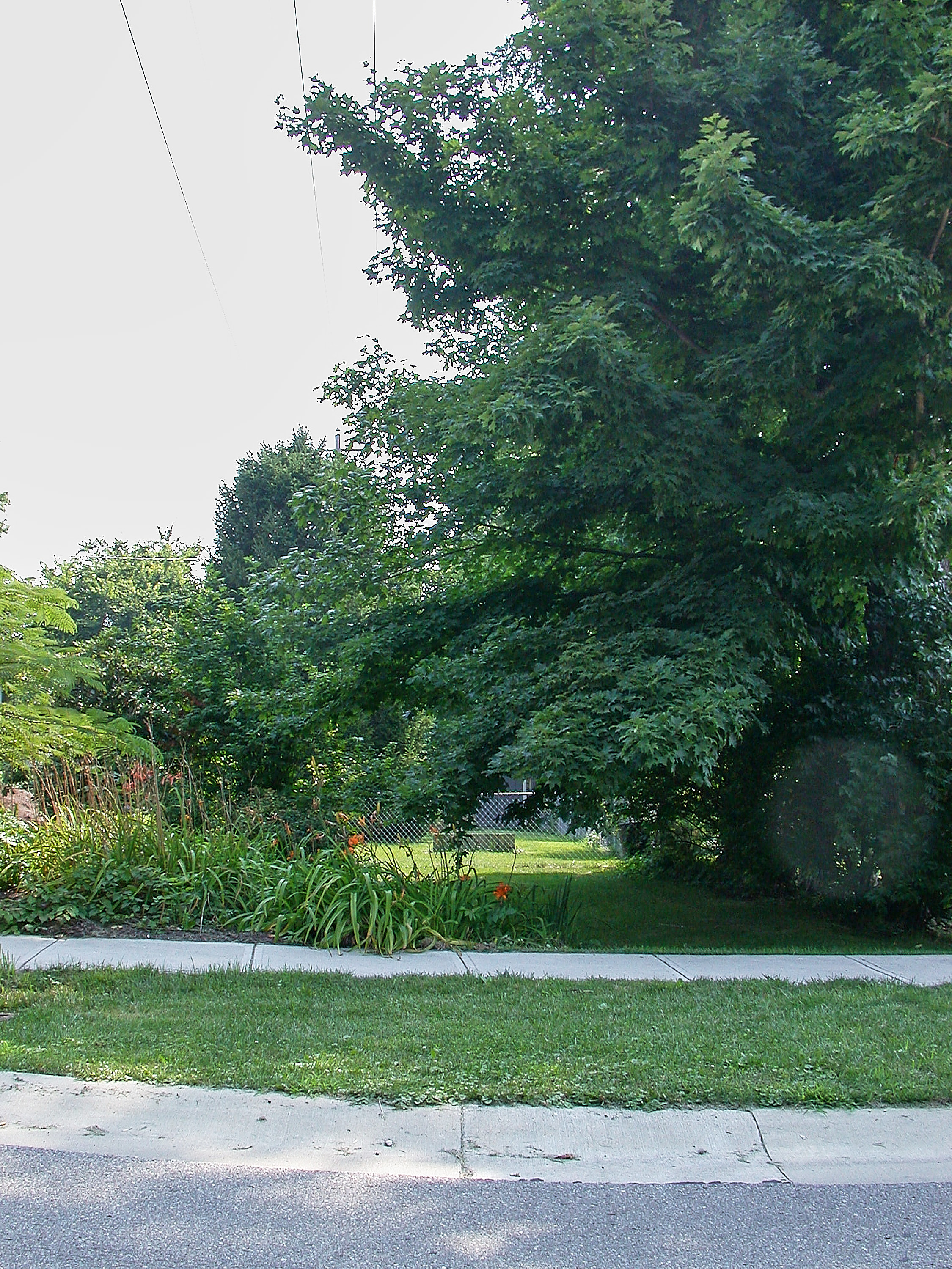 IR&T Rapid Railway right-of-way crossing Riverwood Trail in Kings Mills, looking east. The ROW crossing is right at the entrance to this new housing subdivision, which occupies the hillside to the right. The much older town is to the left.