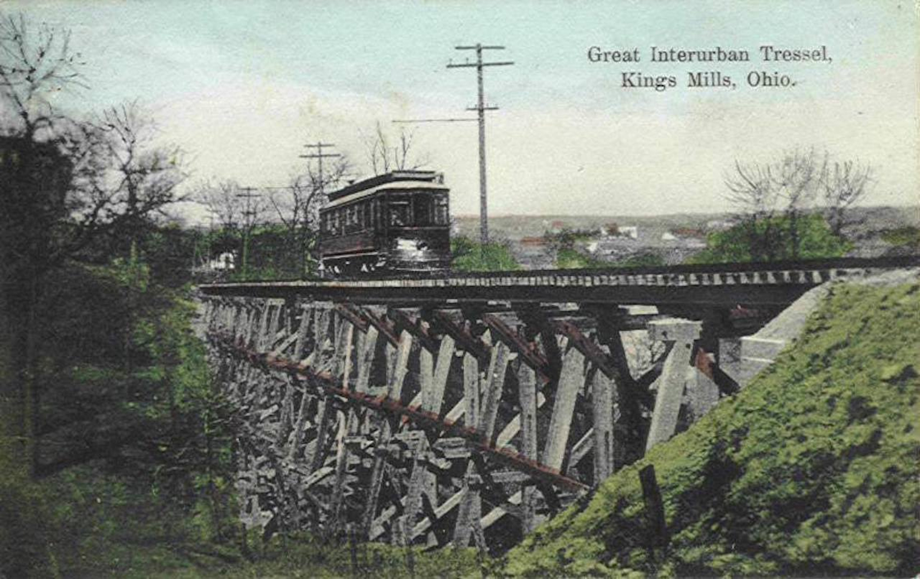 Historic postcard showing an IR&T Rapid Railway car and trestle in Kings Mills. This is looking north from Carter Park towards Turtle Creek and Mason-Morrow-Millgrove Road.