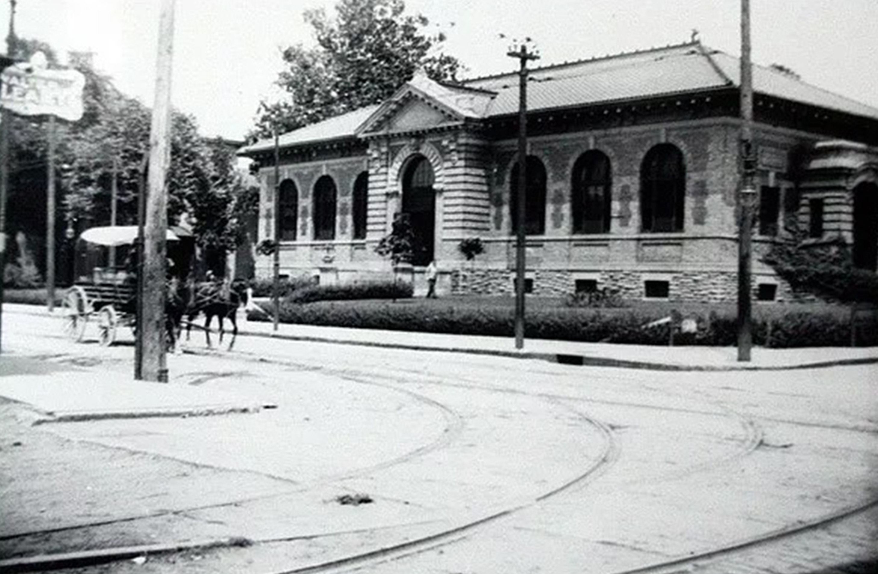 Historic photo of the Carnegie Center at Eastern and Donham Avenues in Columbia-Tusculum, looking north. The tracks curving at the bottom are leading to the Donham Avenue viaduct used by the CG&P and IR&T.
