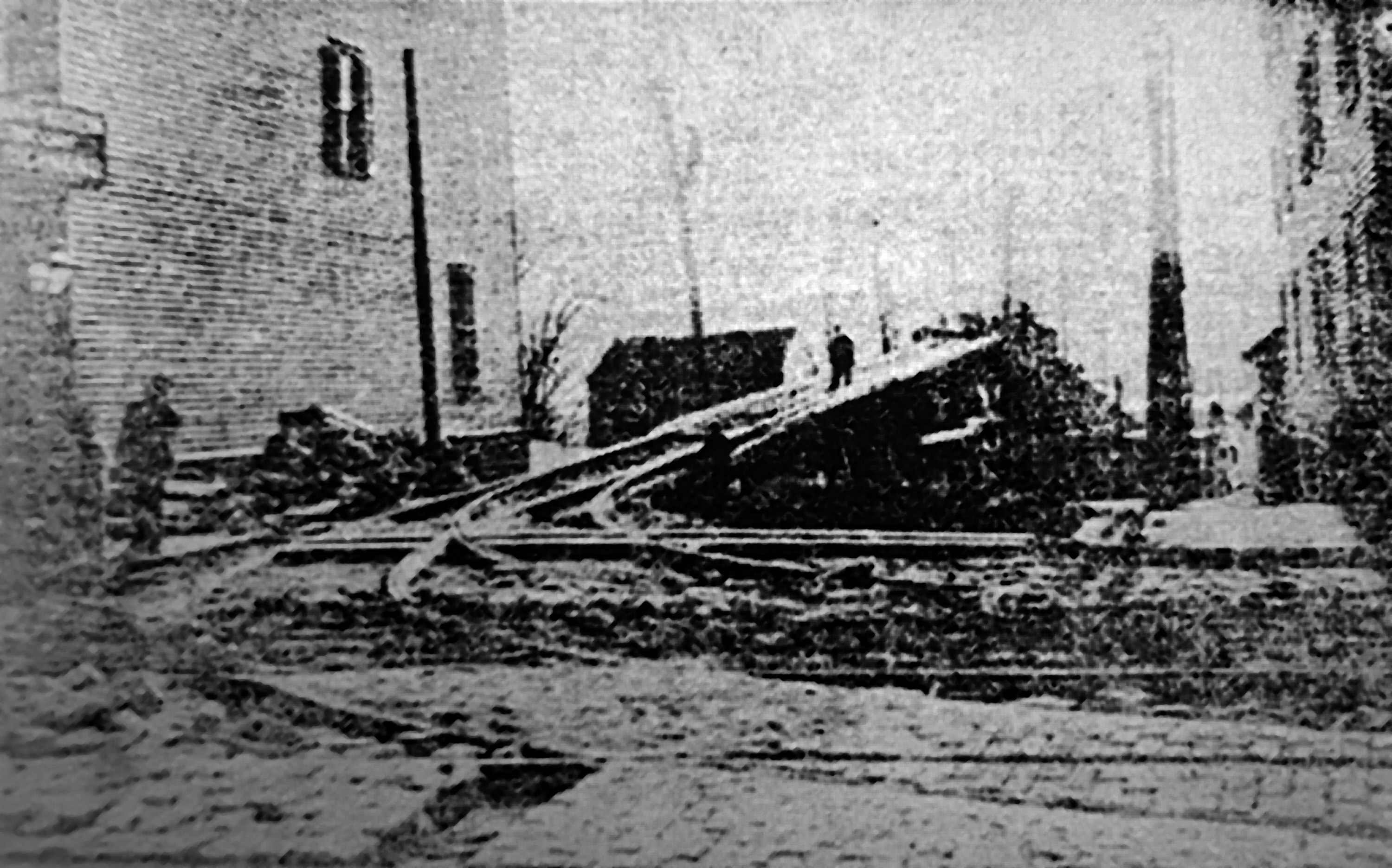 Historic photo of track construction on the Donham Avenue Viaduct at Eastern Avenue in Columbia-Tusculum in 1903, looking southwest across Eastern Avenue.