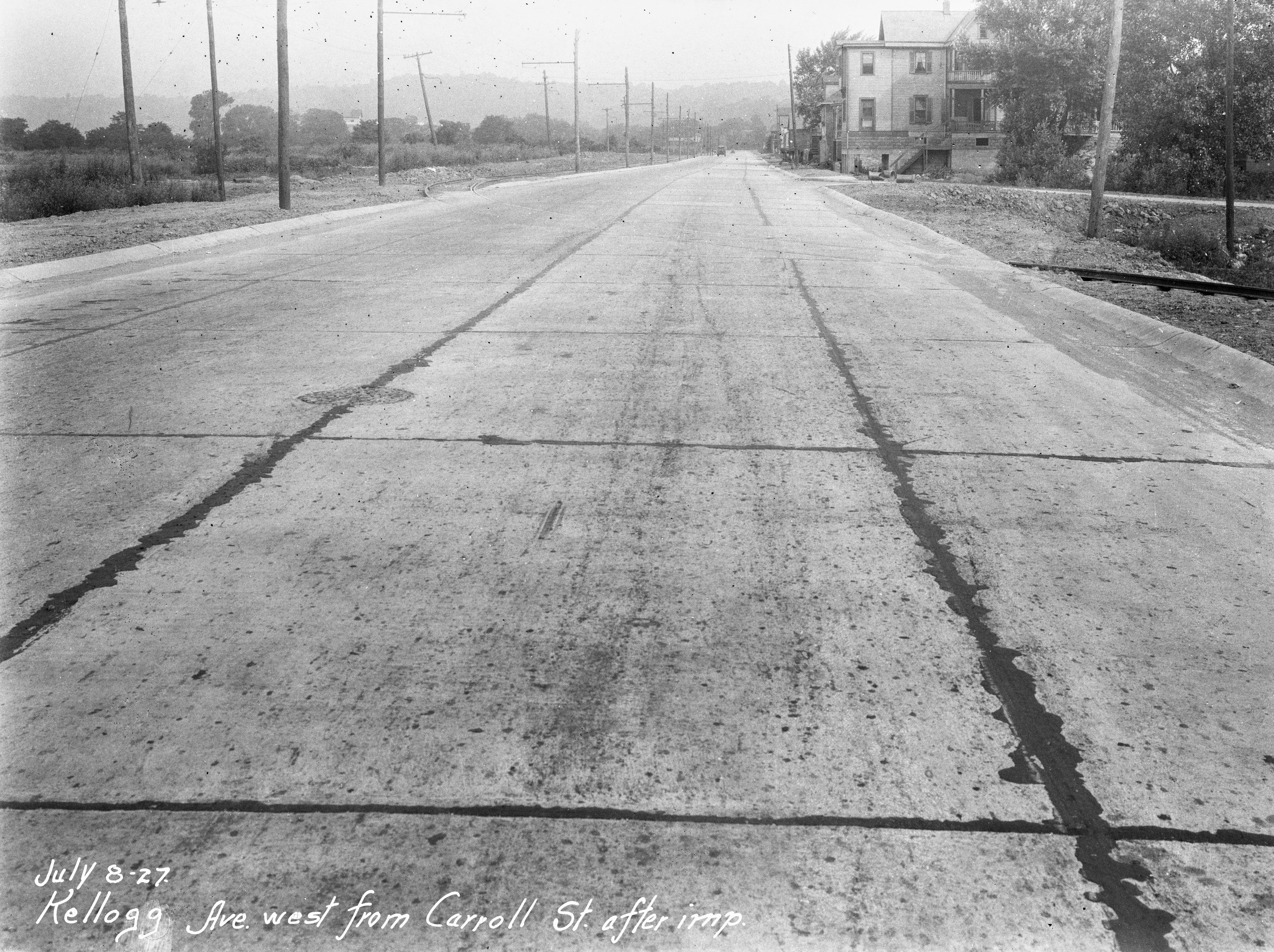 Historic photo of the CG&P on Kellogg Avenue in Columbia-Tusculum, looking northwest from Carrel Street after repaving. As seen previously, after moving the tracks to the far side of Kellogg, the CG&P still used the same poles and move the wire support cross arms. From the University of Cincinnati Library Digital Resource Commons, Street Construction and Improvements collection.