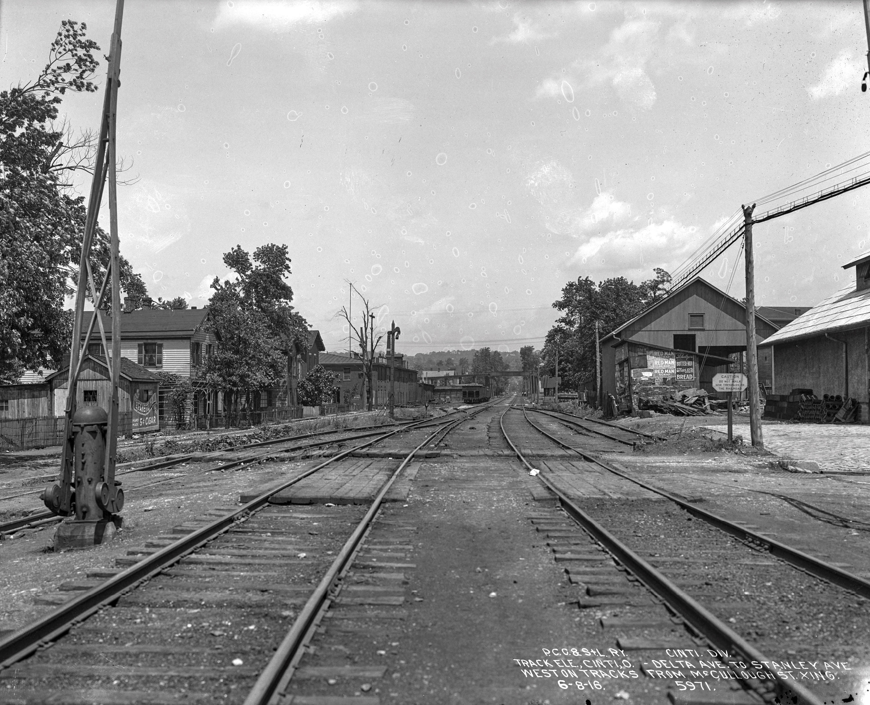 Historic photo of the former Pennsylvania/Little Miami Railroad and CG&P connection at McCullough Street in Columbia-Tusculum, looking northwest. The CG&P track is the one to the left, and the Donham Avenue viaduct is visible in the distance. This photo was taken in preparation for the construction of overpasses at Delta and Stanley, which would eliminate the need for the Donham Avenue Viaduct.