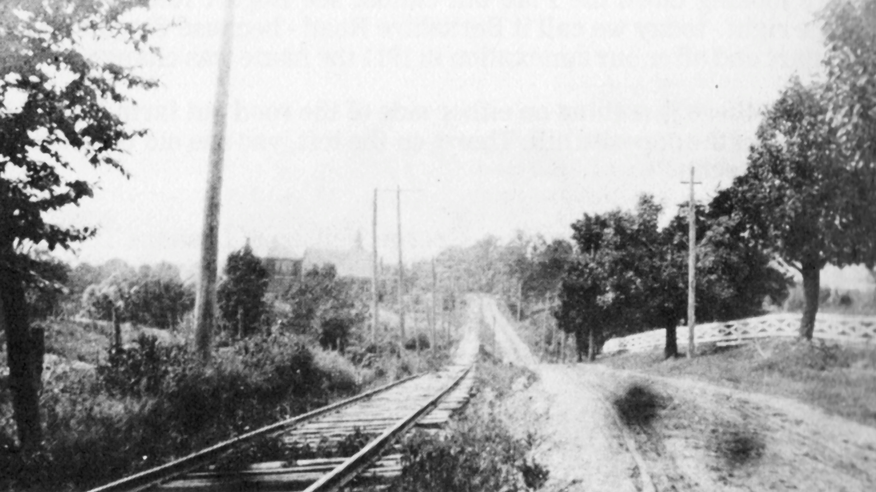 Historic photo of the IR&T along Beechmont Road in Mt. Washington, looking northwest towards Berkshire Road from near Burney Lane. The trestle and intersection of Berkshire from the previous photo are at the bottom of the dip in the road.