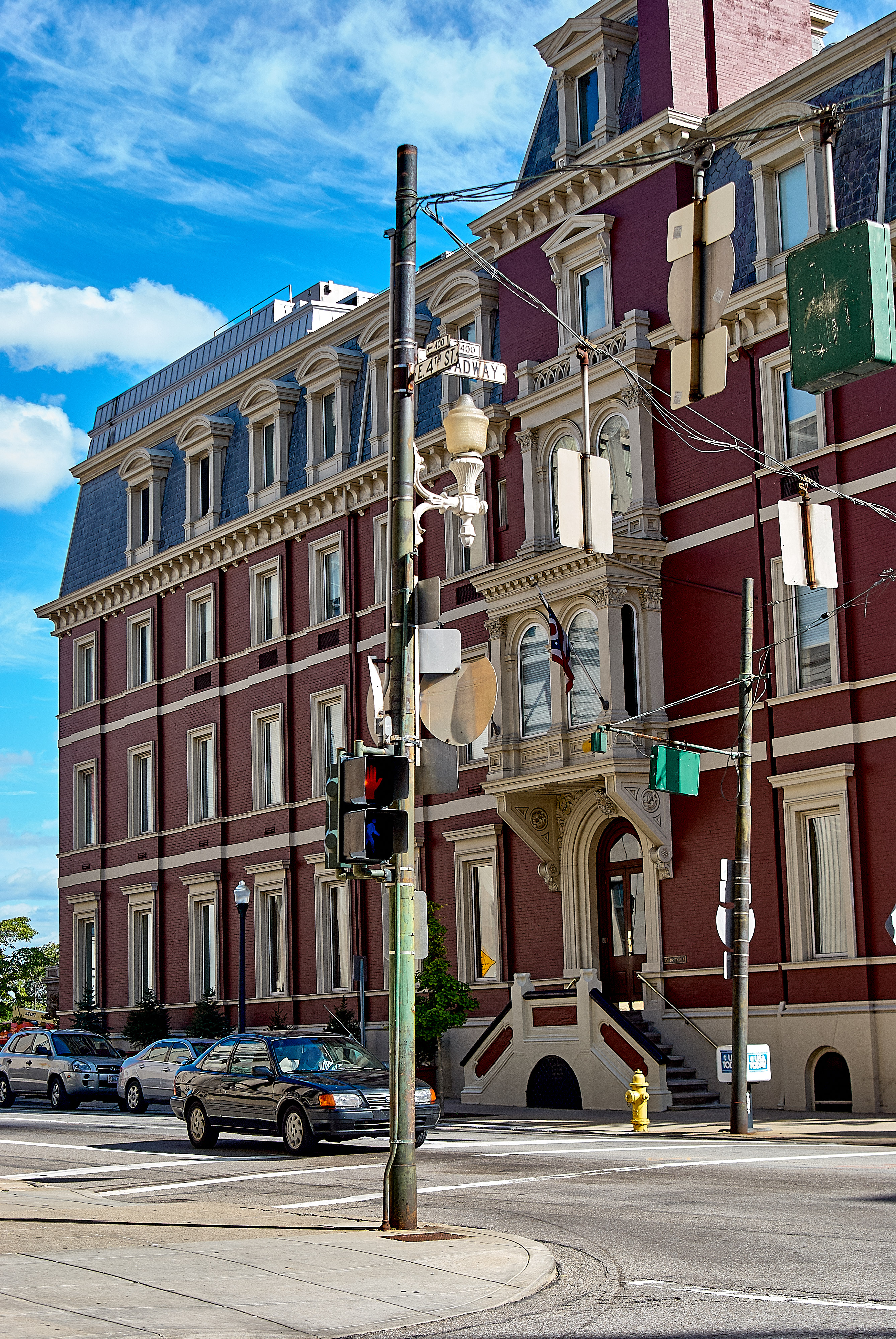 A once common set of trolley poles, old signs, and lights at 4th and Broadway, looking southeast. These have since been replaced.