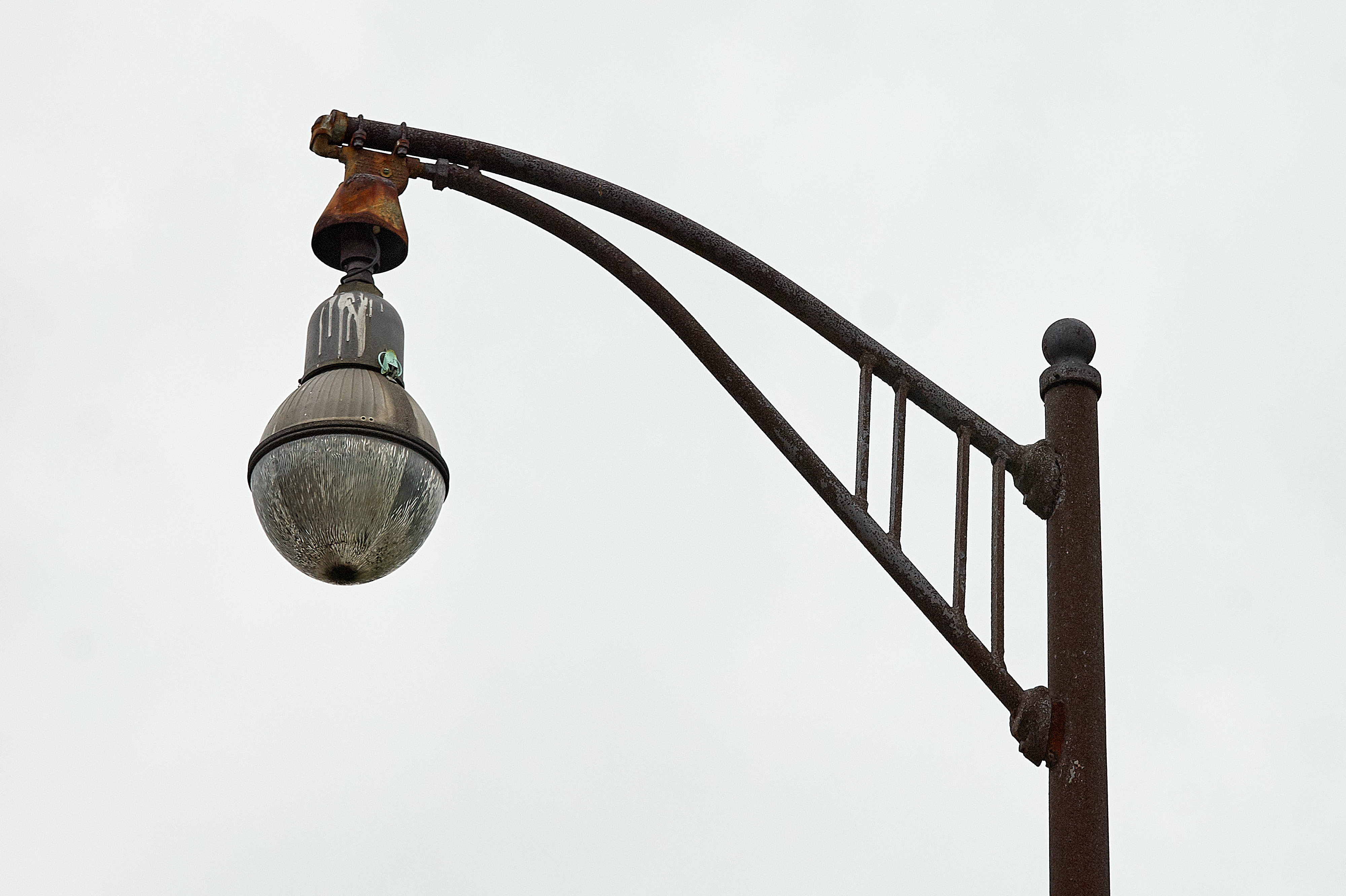 A unique overhead light at Duke Energy's Oakley substation. The design of the bracket and the acorn luminair suggests that this probably dates to the 1950s.