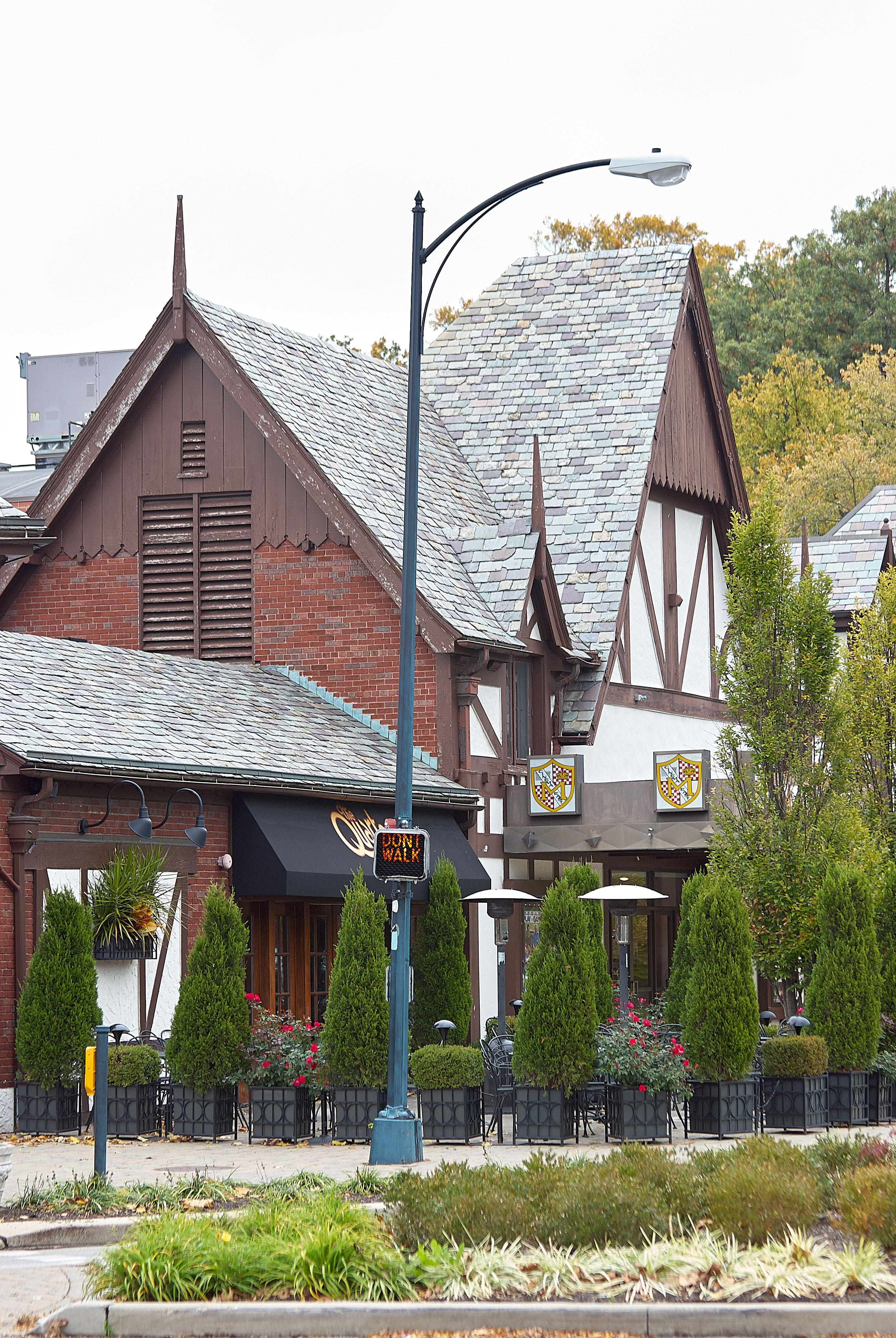 A typical older overhead street light in Mariemont, near the Mariemont Theater. While the cobra head luminaire is relatively new, the pole is quite old.