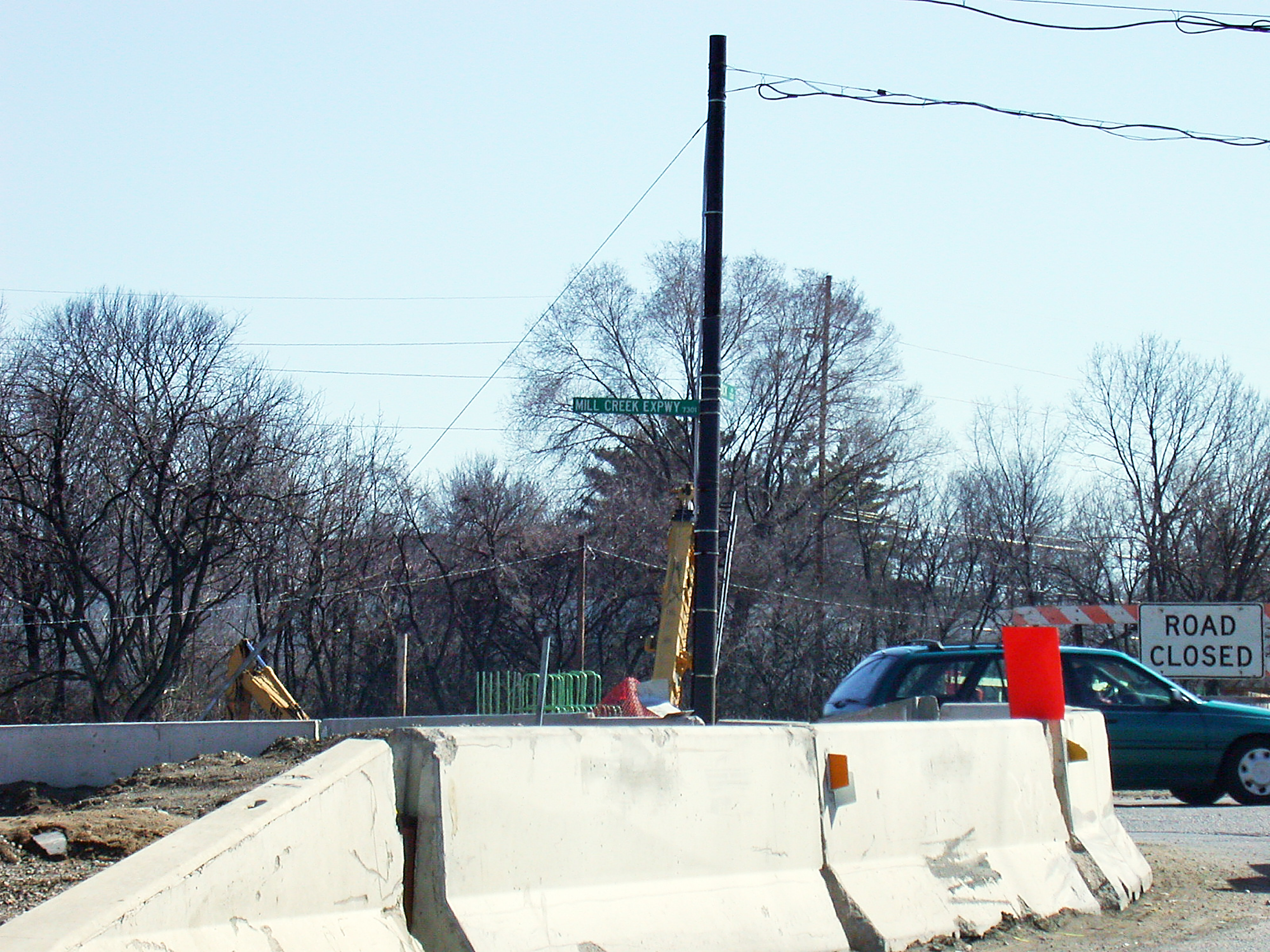 Mill Creek Expressway sign mounted on a pole that looks like a trolley pole, but is not, looking southeast at Paddock Road and I-75. For a long time I-75 was called the Mill Creek Expressway. This name was dropped decades ago, but it is still found on some maps. This sign was the only one left, until it was removed during construction of the new Paddock Road overpass in 2002.