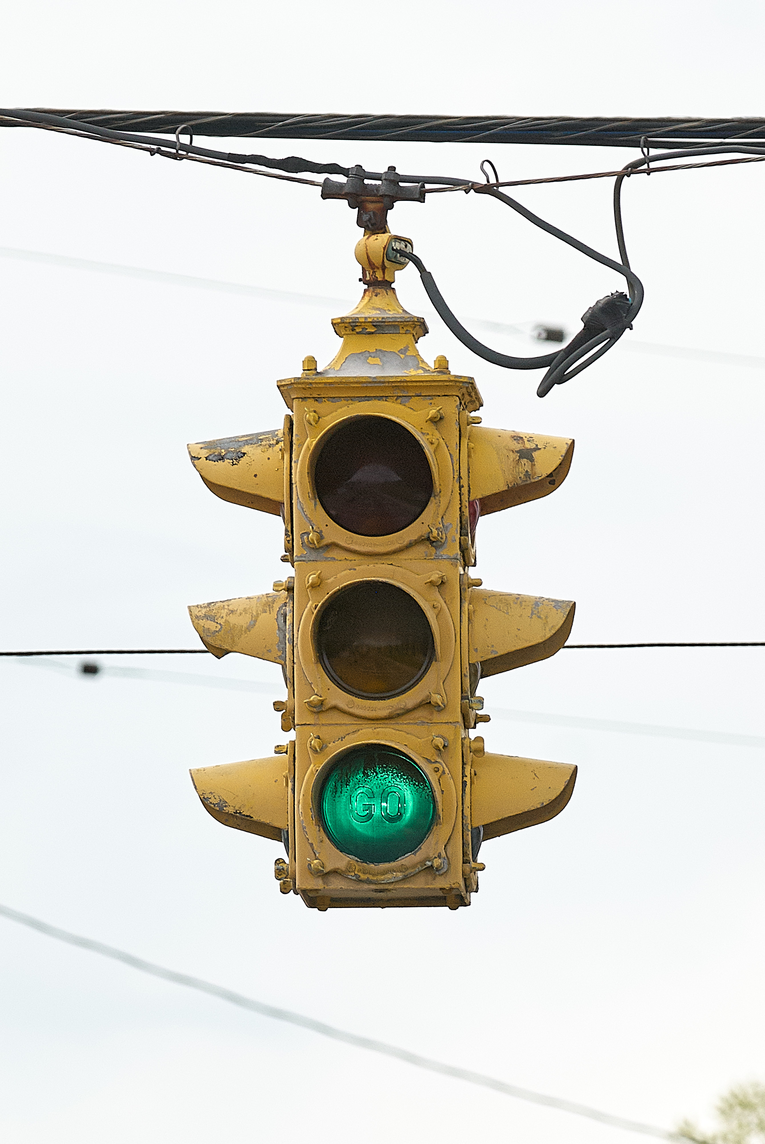 Close-up of the 1926-1929 era Crouse-Hinds Type T signal at Sherman and Allison in Norwood. Even though the paint is in rough shape, this signal is cast aluminum, so it's not in immediate danger of rusting out. Nevertheless, this has been here for a very long time, and it could use a little TLC. Notice that the green lens says "GO" on it. The yellow lens says "CAUTION" and some of the other sides still have the original red lenses that say "STOP" on them as well.