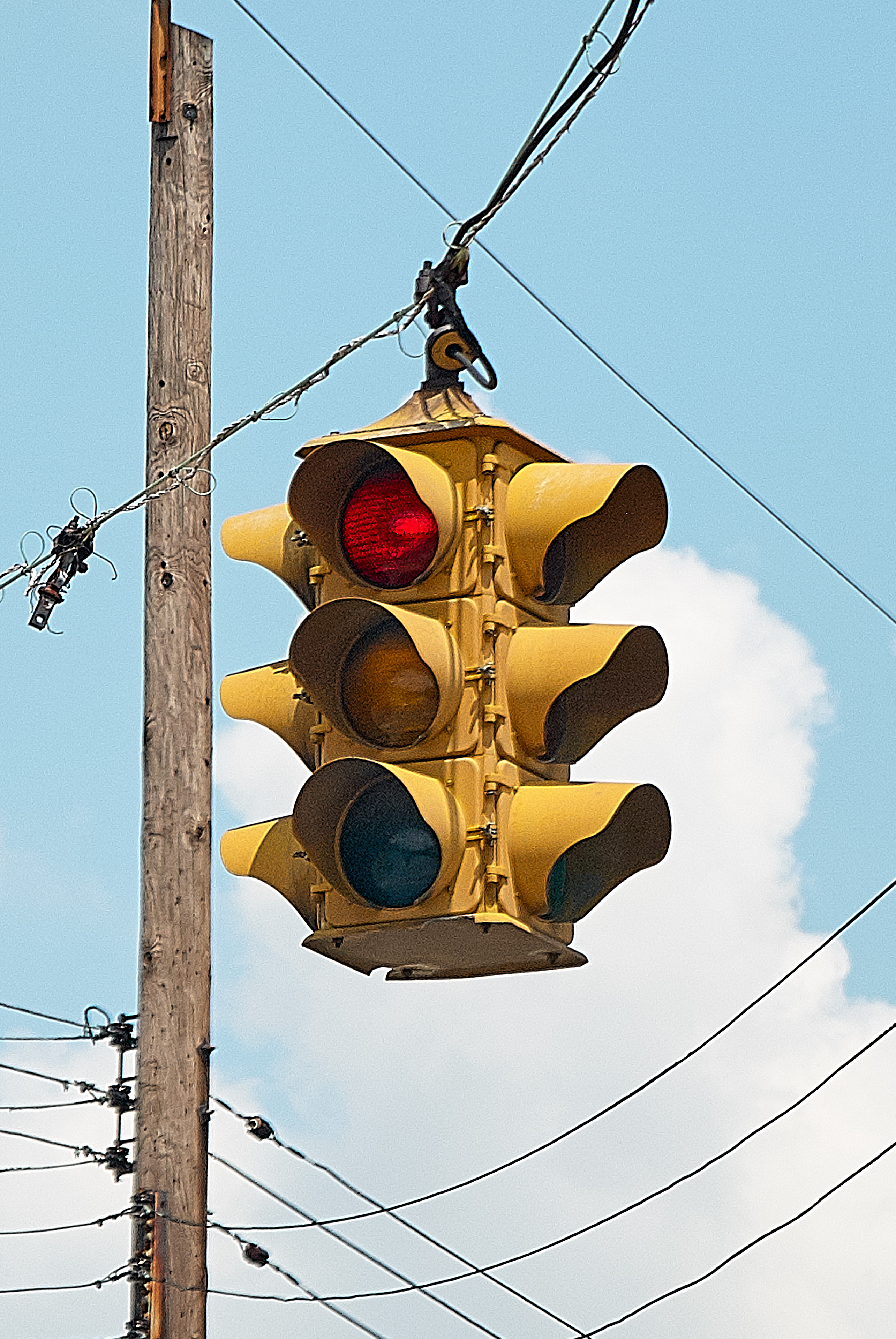 An Eagle Signals Eaglelux 4-way pagoda in Lockland at Williams and Dunn. This is the equivalent 4-way of the single-faced Eagleluxes installed in Cincinnati in the 1940s and early 50s. This intersection no longer has signals at all, as there is just a stop sign.
