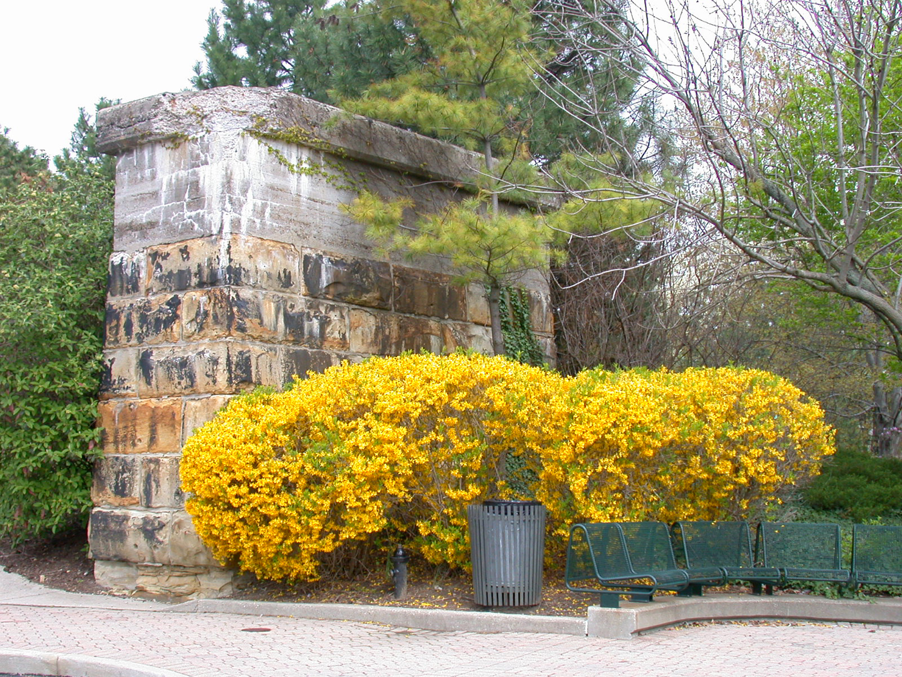 Newport Southbank (Purple People, formerly L&N Railroad) Bridge approach trestle piers in Sawyer Point, looking southeast. These large supports, made of the same stone as some of the bridge's piers, were left as a landscape element of the park.