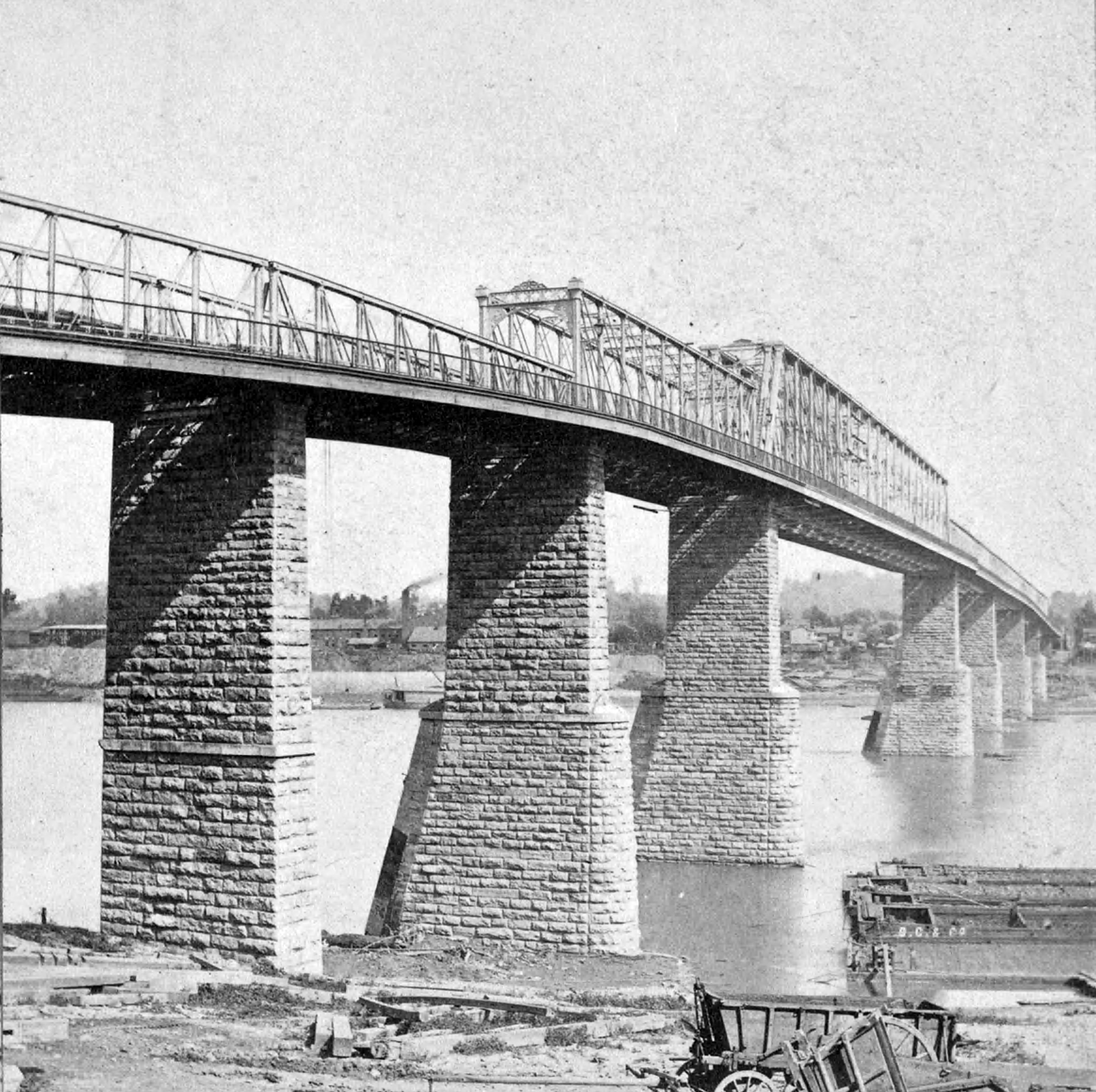 The Newport & Cincinnati Bridge as it appeared between its initial construction in 1872 and major rebuilding in 1897, looking southeast towards Newport. At this time there was a single railroad track in the middle of the bridge with small cart paths and sidewalks cantilevered off either side.