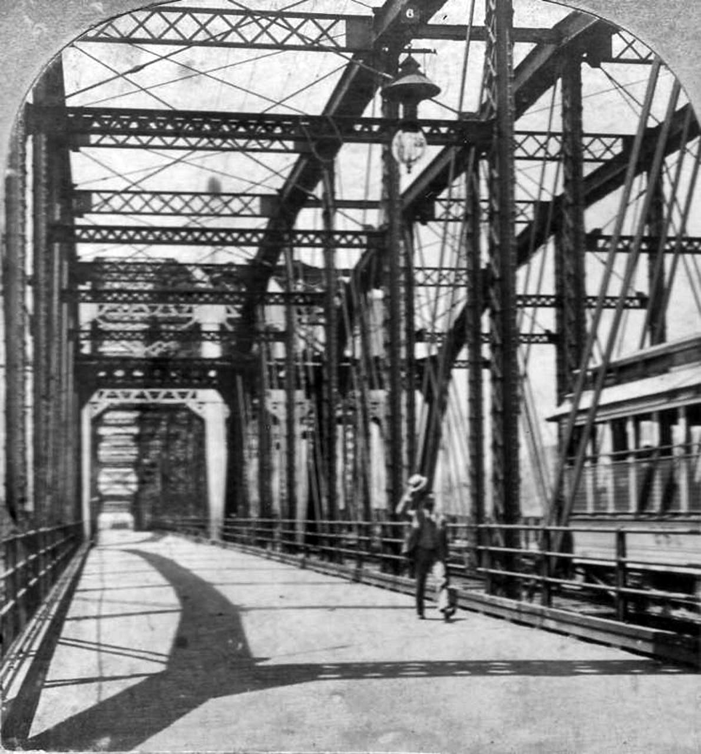 Historic photo of the L&N Bridge after its reconstruction in 1897, looking north towards Cincinnati. Note the streetcar in the middle section of the bridge where the sidewalk is today. That was for northbound streetcars, while southbound ones were cantilevered off the west side of the bridge, out of the picture to the left.