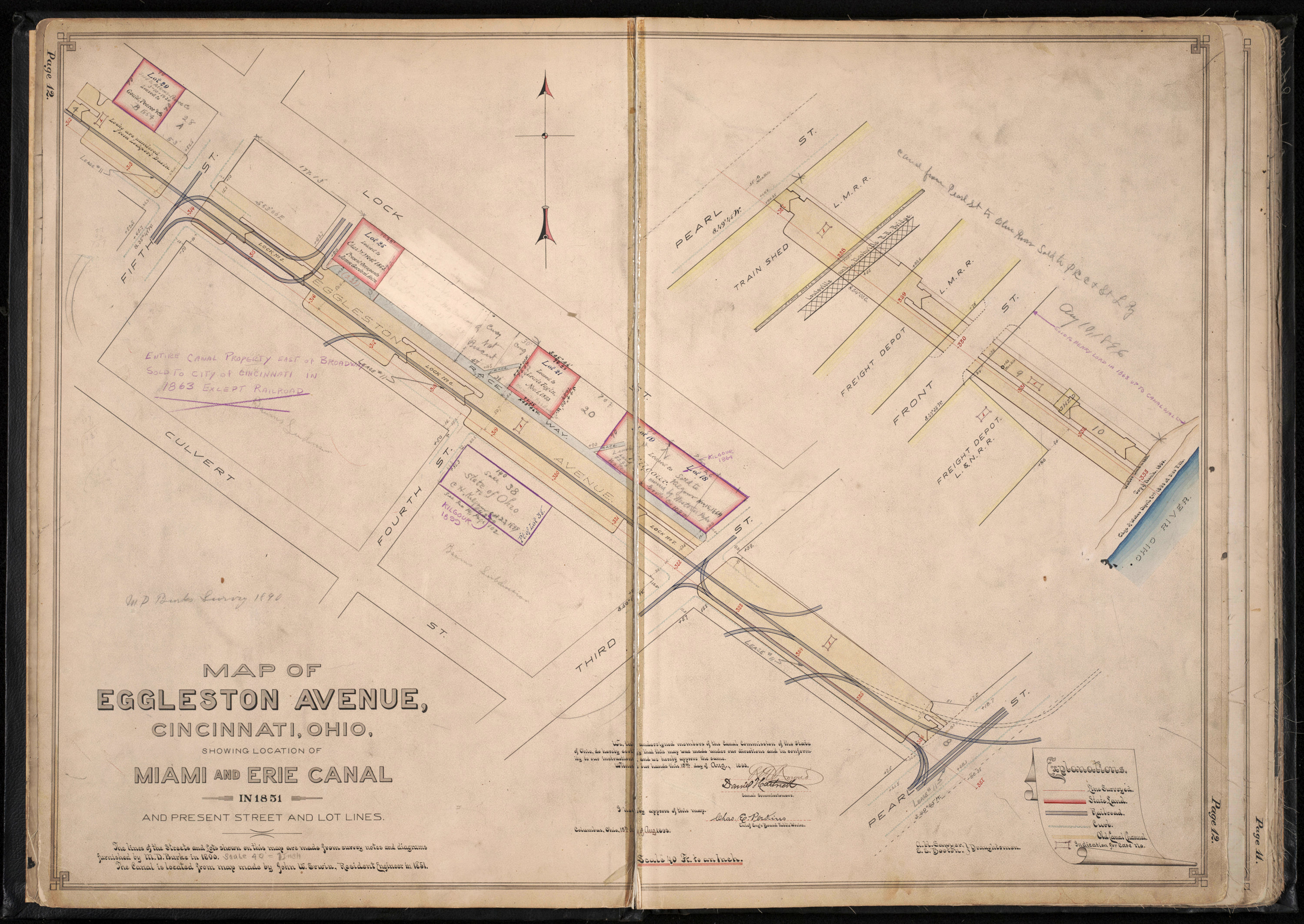 Historical plat map of the Miami & Erie Canal under Eggleston Avenue. the overlay of 1890 streets and railroads over the map from 1850 suggests that the locks may still be buried underneath the street.