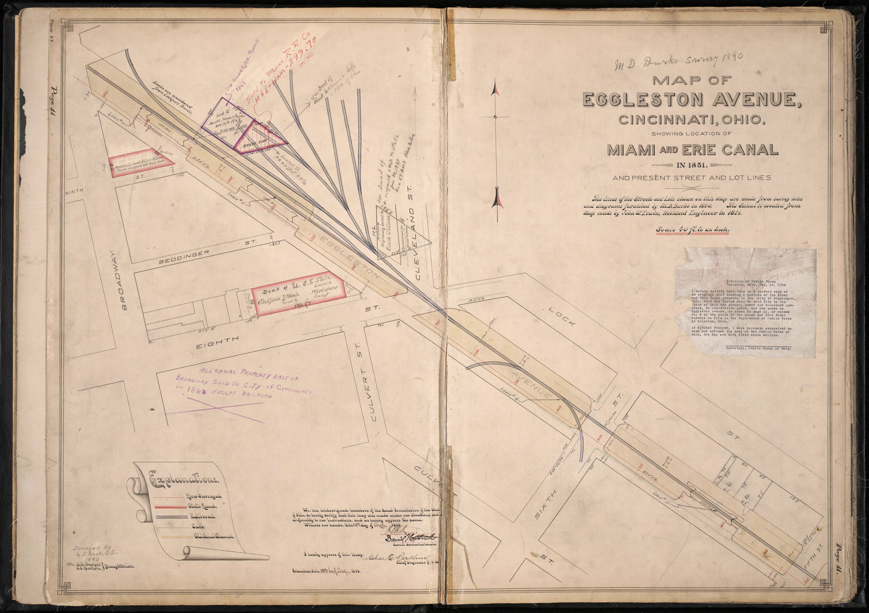Historical plat map of the Miami & Erie Canal under Eggleston Avenue. the overlay of 1890 streets and railroads over the map from 1850 suggests that the locks may still be buried underneath the street. Lock Street is buried under I-471 and Cleveland Street is now Reedy Street.