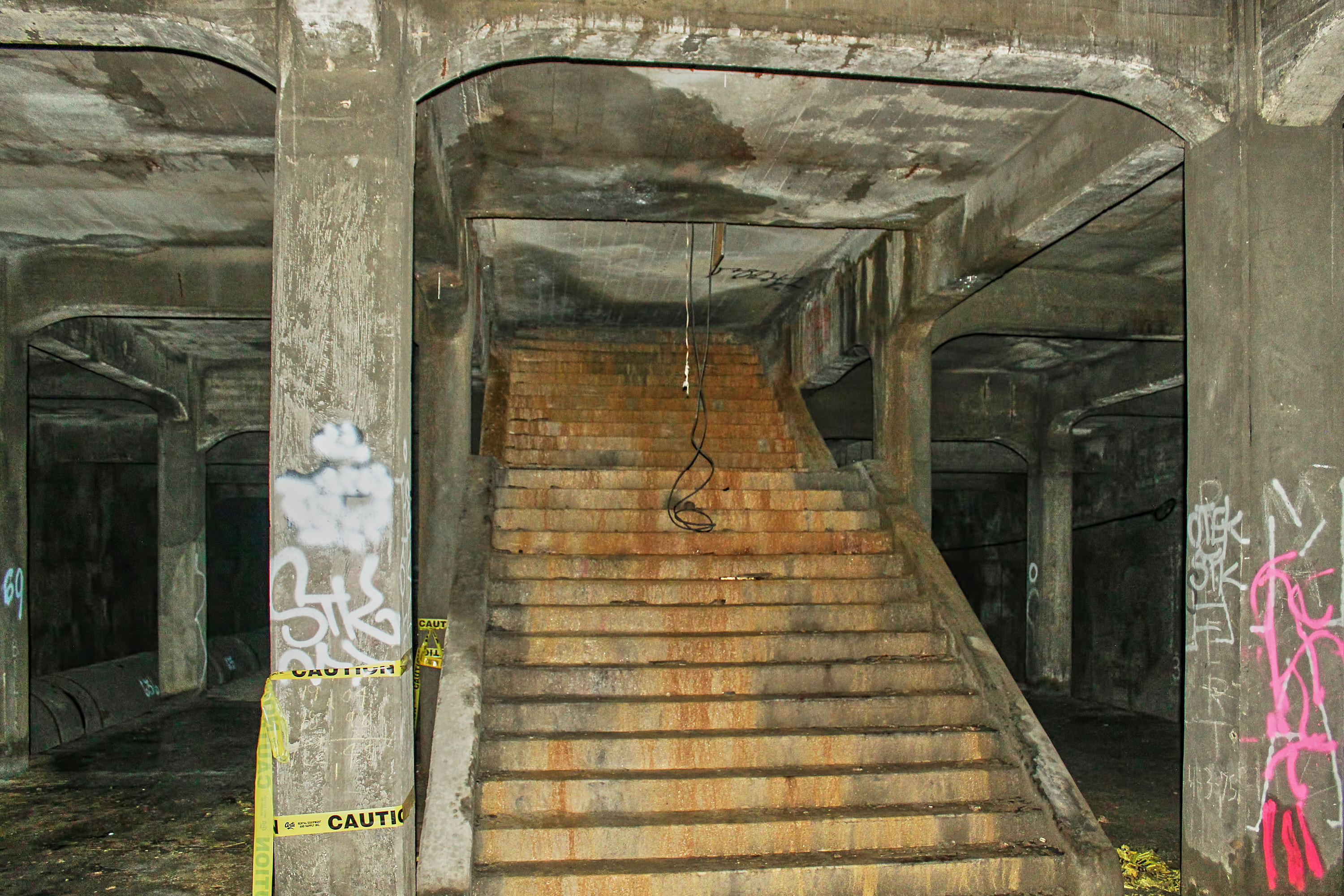 The subway's Race Street station stairs to Race Street, looking west. These stairs originally surfaced on the east side of Race Street in the median of Central Parkway. Another set of stairs was on the other side of the street. Photo provided anonymously.