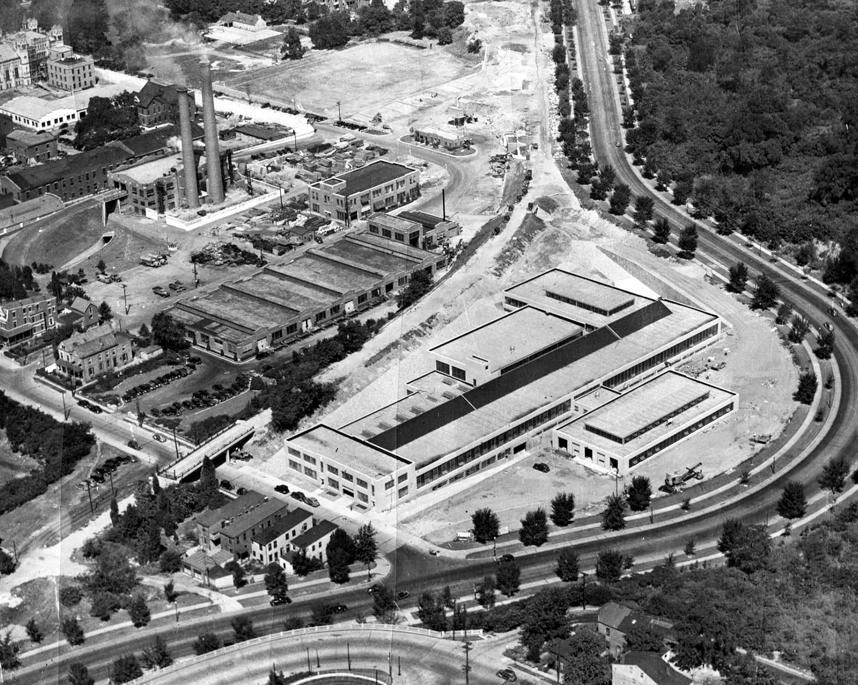 Historic photo of the subway right-of-way in Camp Washington, looking northwest across Central Parkway and Bates Avenue. Martin Luther King Drive, Formerly Dixmyth Avenue, is at the very bottom. Note the subway overpass at Bates. The building at center was bult in 1935 and appears to still be under construction in this photo. The Miami & Erie Canal followed the bend in Central Parkway to the right.