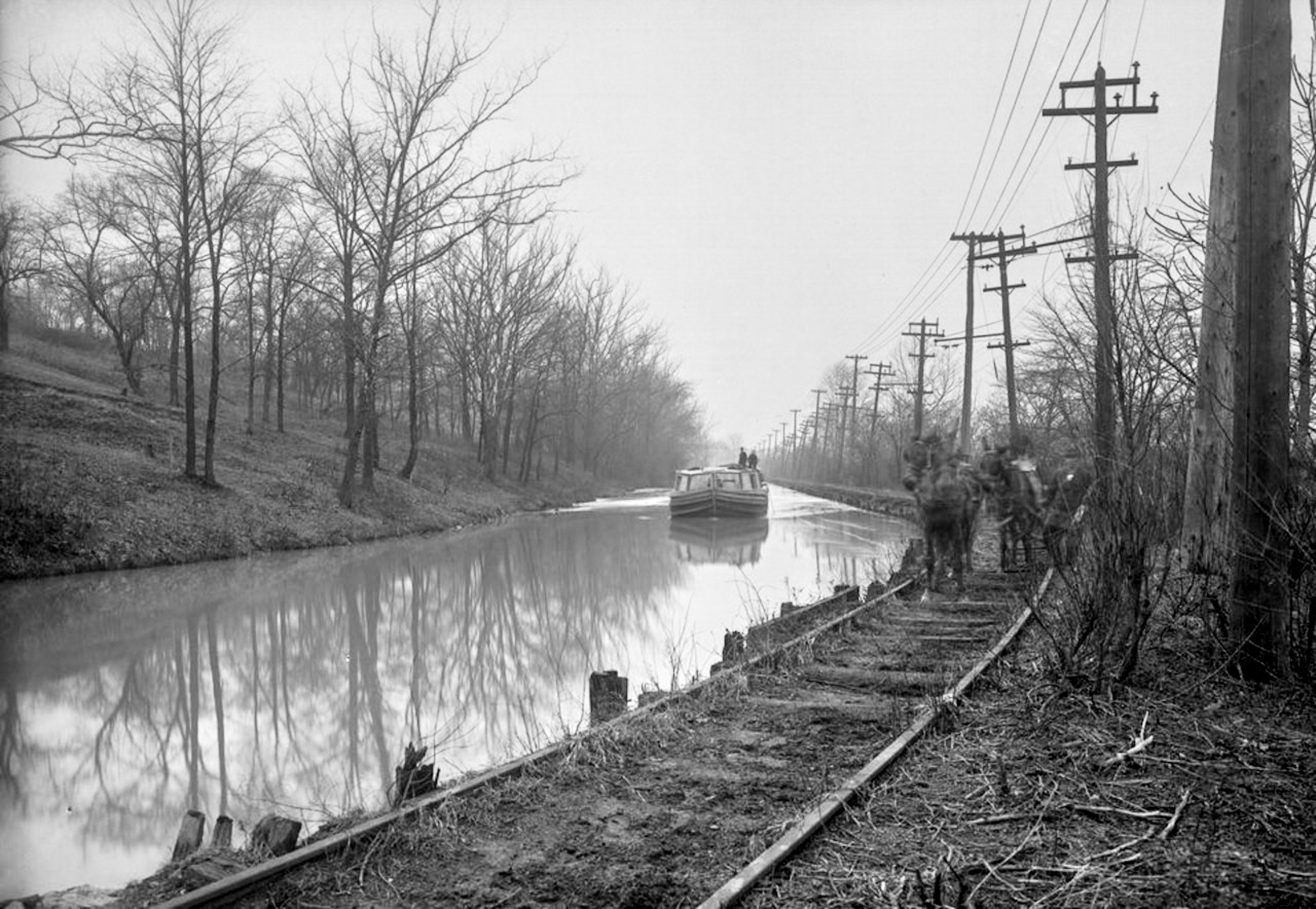 Historic photo of the Miami & Erie Canal at Clifton Avenue in 1912, looking west. This would later become the location of the Clifton Avenue rapid transit station. Note the disused electric mule tracks on the towpath.