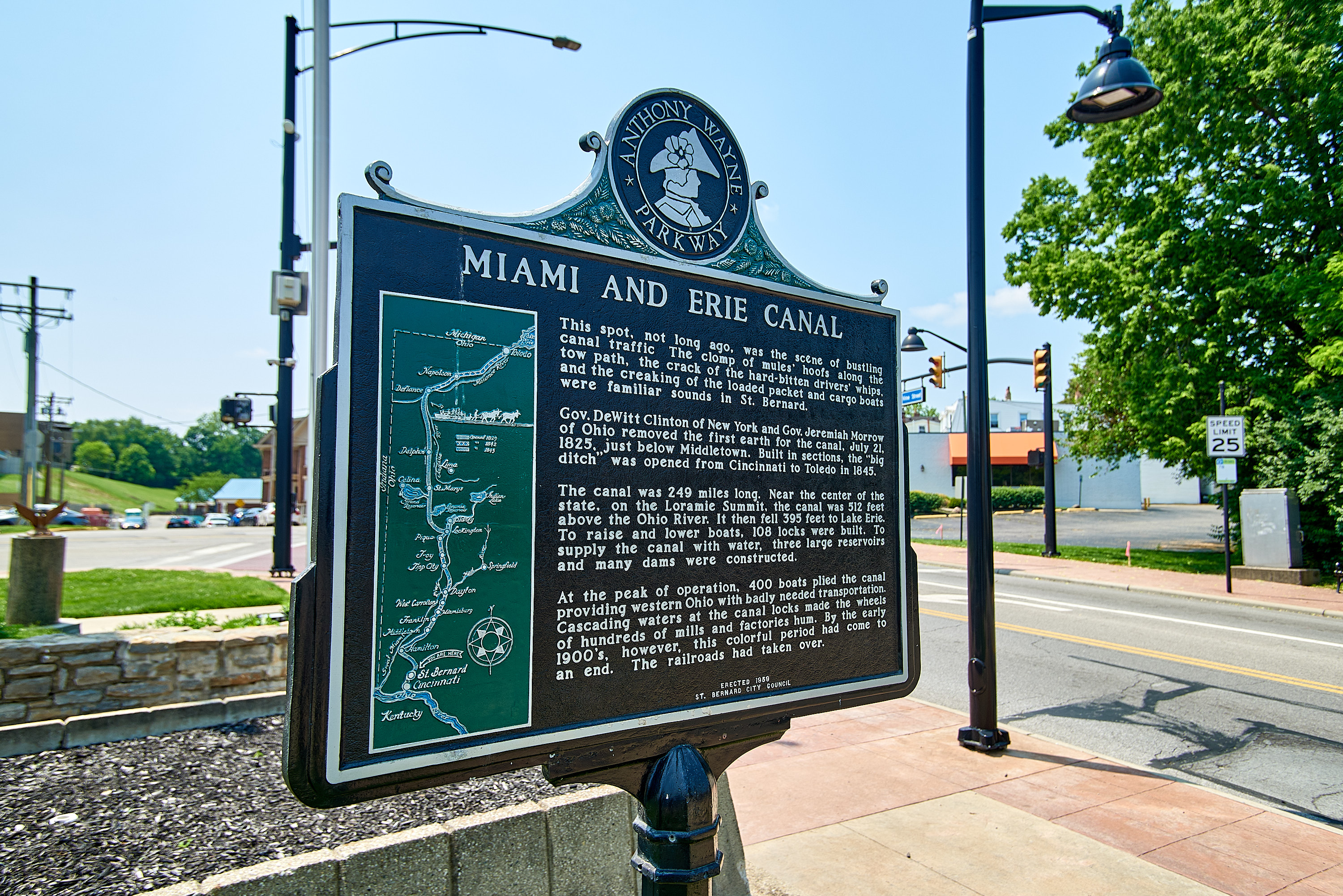 Miami & Erie Canal historical plaque at the St. Bernard municipal building.