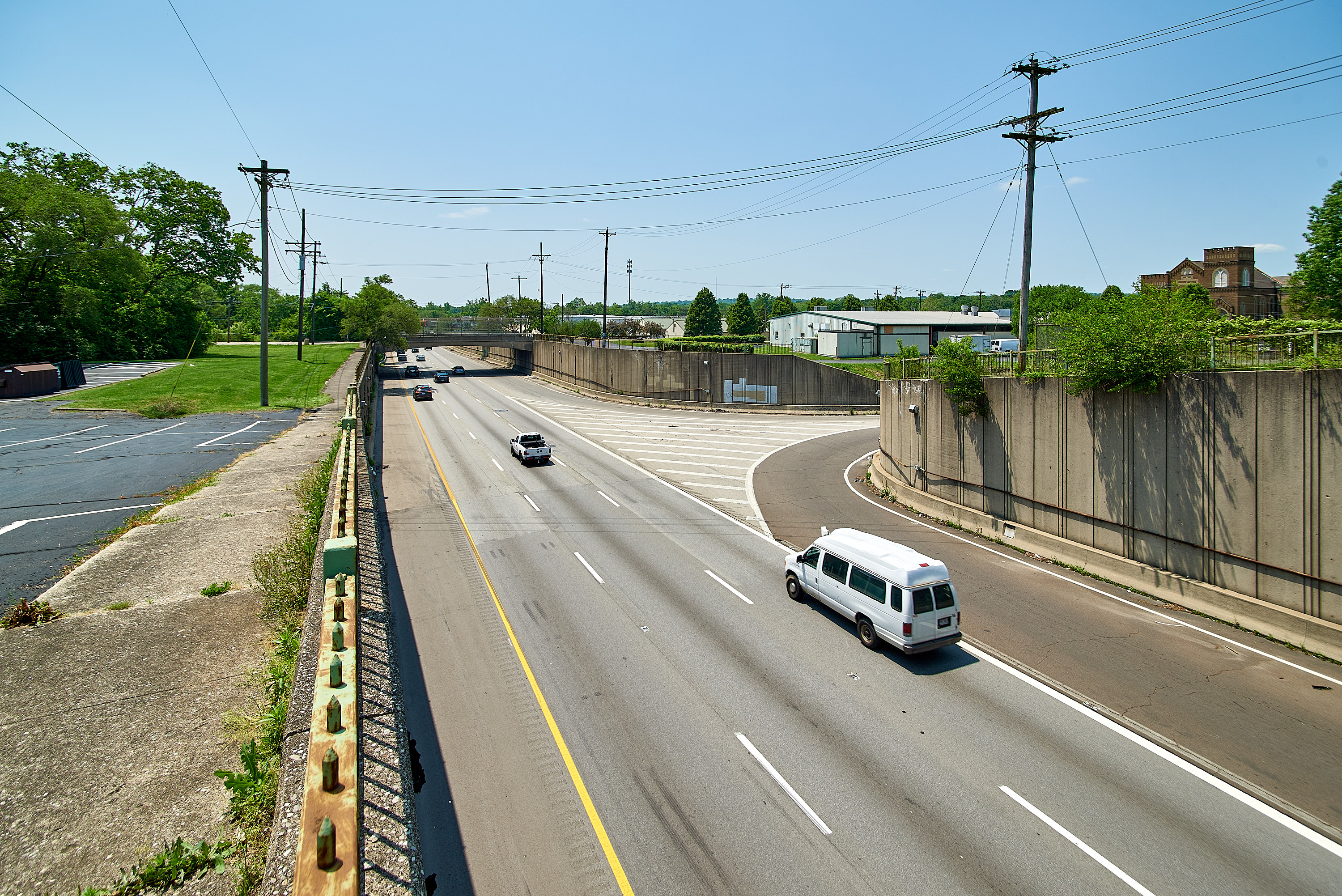 Location of the Miami & Erie Canal, now southbound I-75 in Lockland, looking south at the Cooper Avenue exit and the Lock Street overpass.