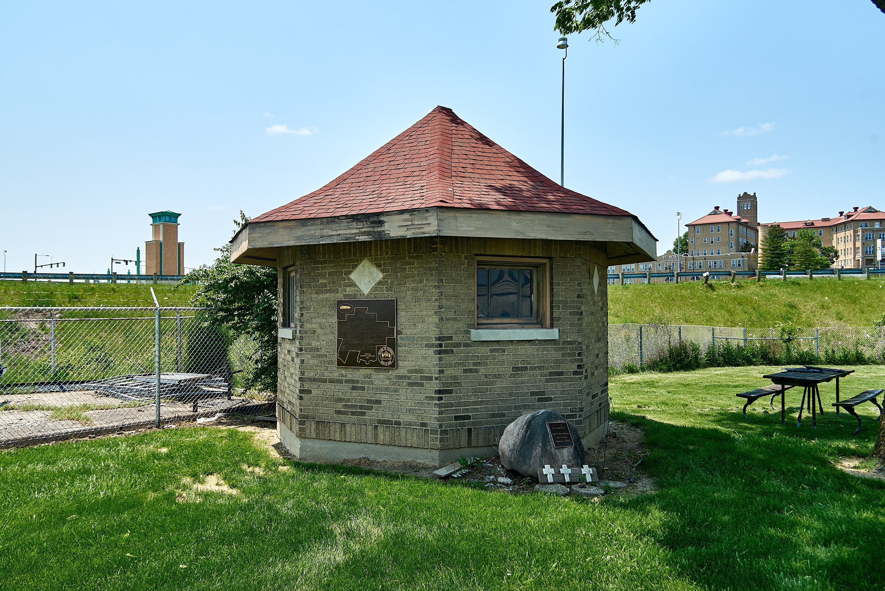 Water pump house near the Miami & Erie Canal in Evendale near the I-75 Glendadle-Milford Road exit, looking southwest from Evendale Drive. It's unlikely that this building had any relation to the canal itself, except perhaps for pumping water from the canal for drinking. One of the highway exit towers is at the left, and St. Rita School for the Deaf is at the right.