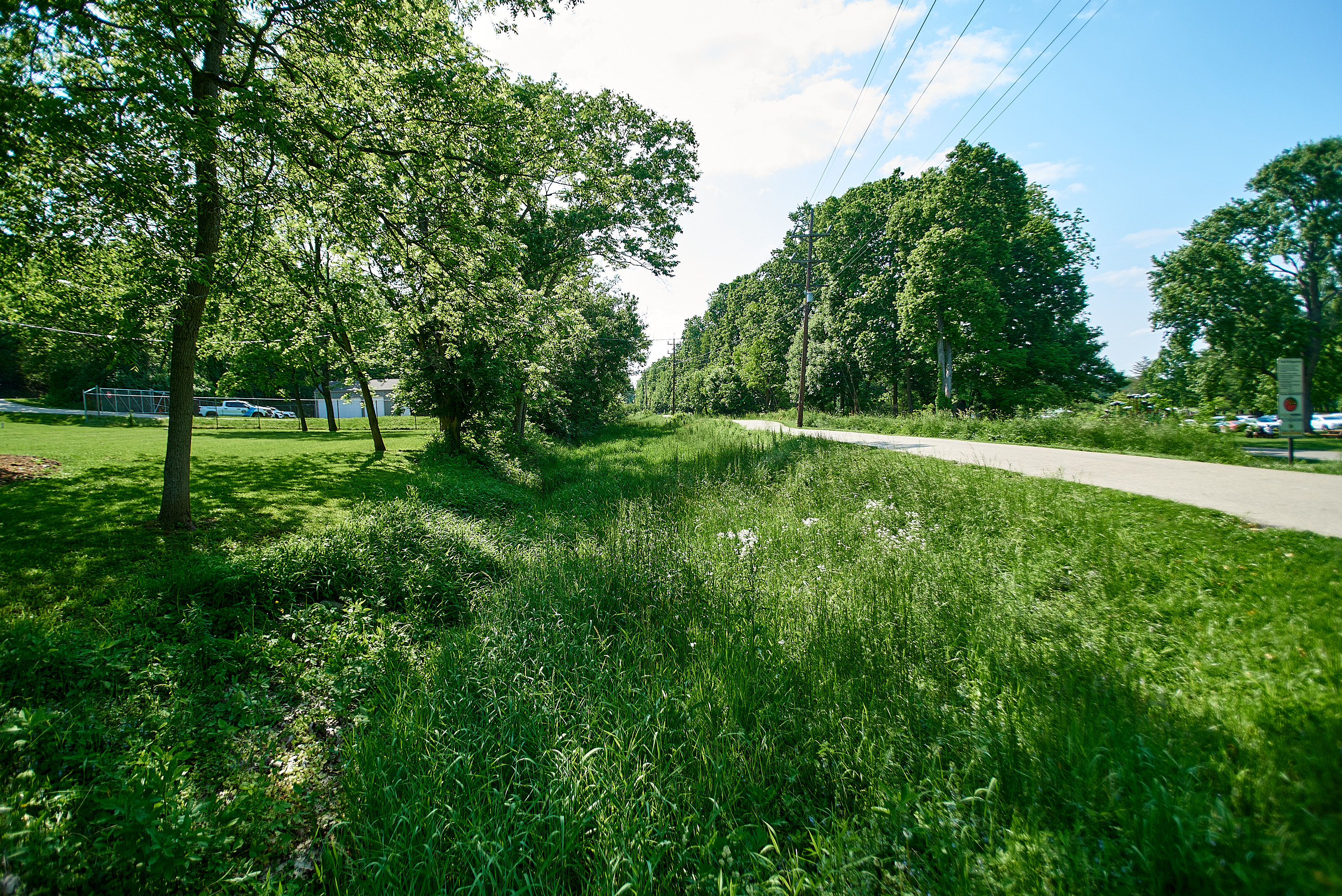 Miami & Erie Canal in Rentschler Forest MetroPark, looking west from the driveway to the athletic fields. The recreational trail at the right is on the towpath.