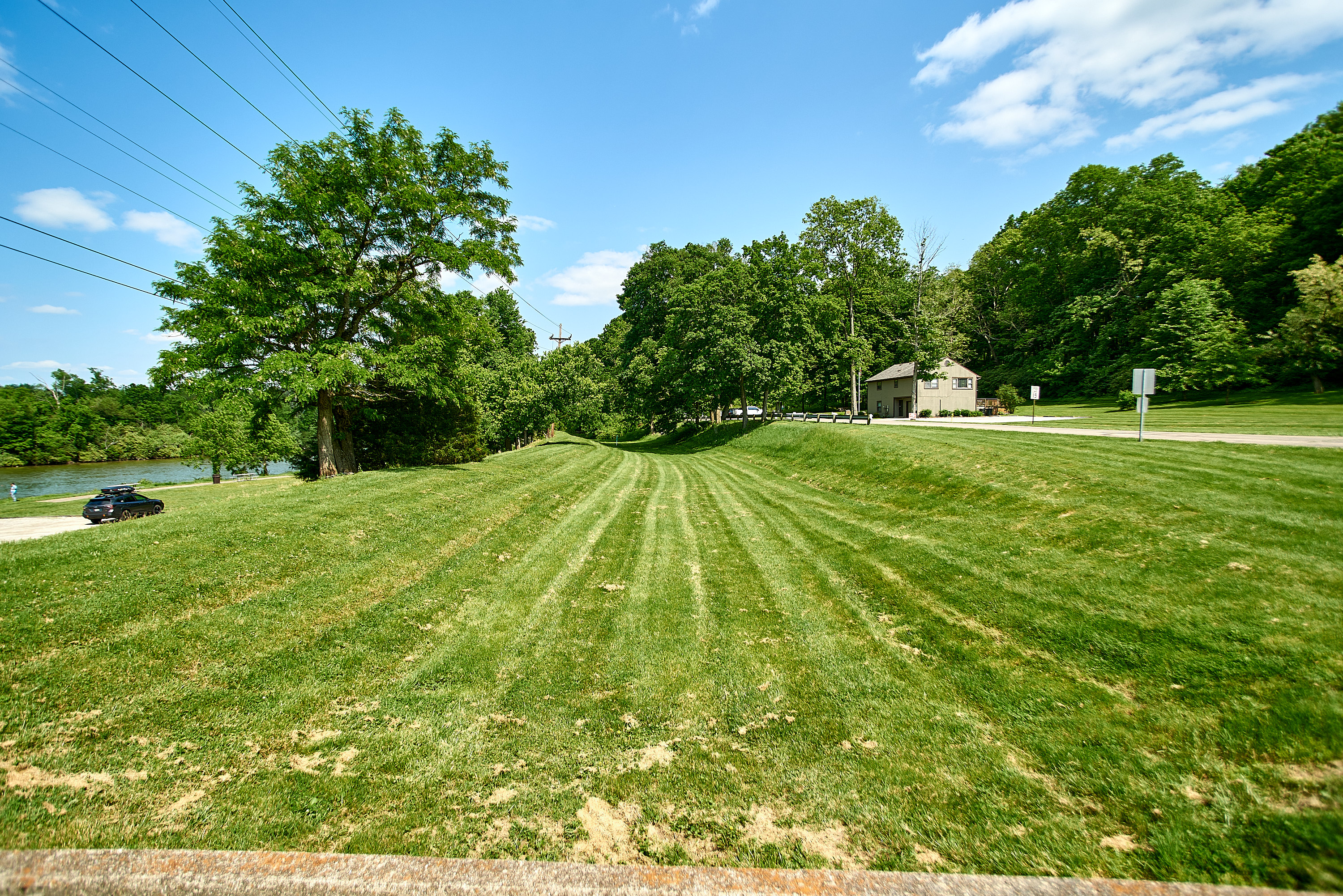 Miami & Erie Canal in Rentschler Forest MetroPark, looking east from the canoe launch and lower picnic area driveway. The canal prism is very evident here. At the left is a sizable riprap overflow spillway seen in the following photos.