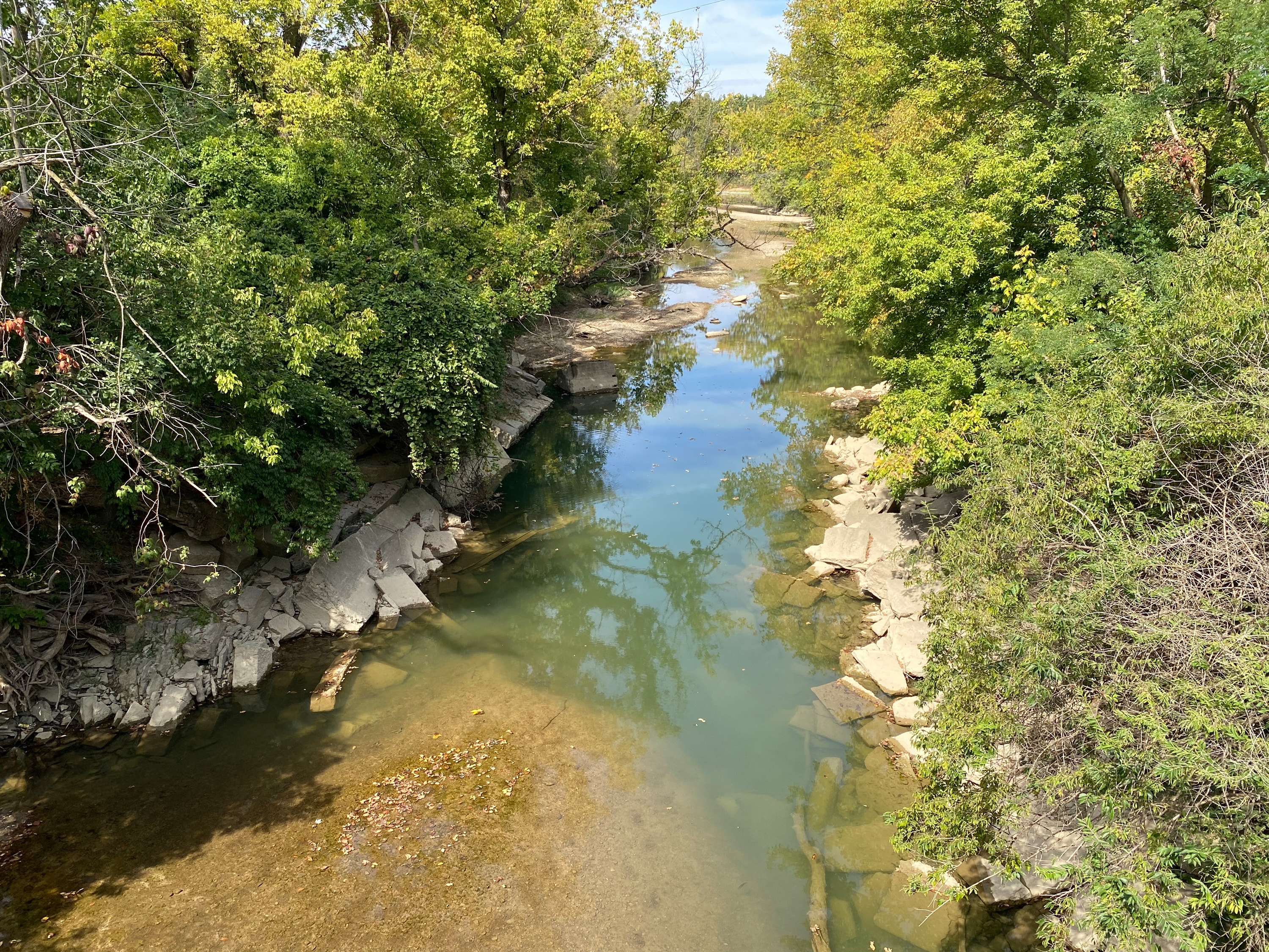 Remains of the Miami & Erie Canal LeSourdsville/Gregory Creek Aqueduct at Monroe Bicentennial Commons, looking north northwest from the former CH&D Railroad bridge over Gregory Creek. There appears to be a mix of both concrete and stone, whereas the rest of the creek is mainly gravel. The Great Miami River is in the distance.