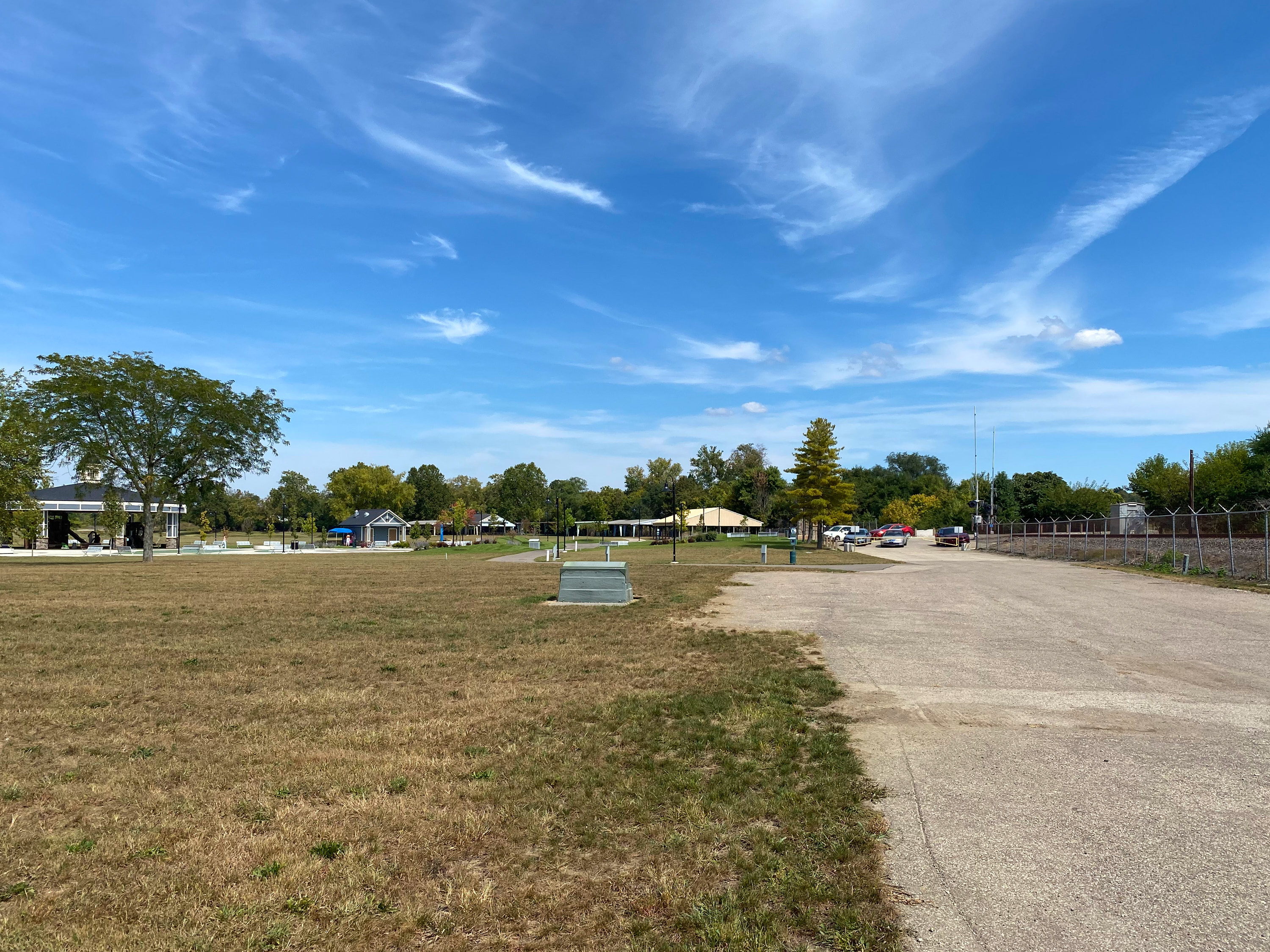 Miami & Erie Canal route through Monroe Bicentennial Commons, formerly LeSourdsville Lake Amusement Park, looking northeast towards the entrance. The former CH&D Railroad is on the right. The canal ran basically down the center of the photo. The lake was a former ice pond adjacent to the canal. There's no grading left that shows evidence of the canal.