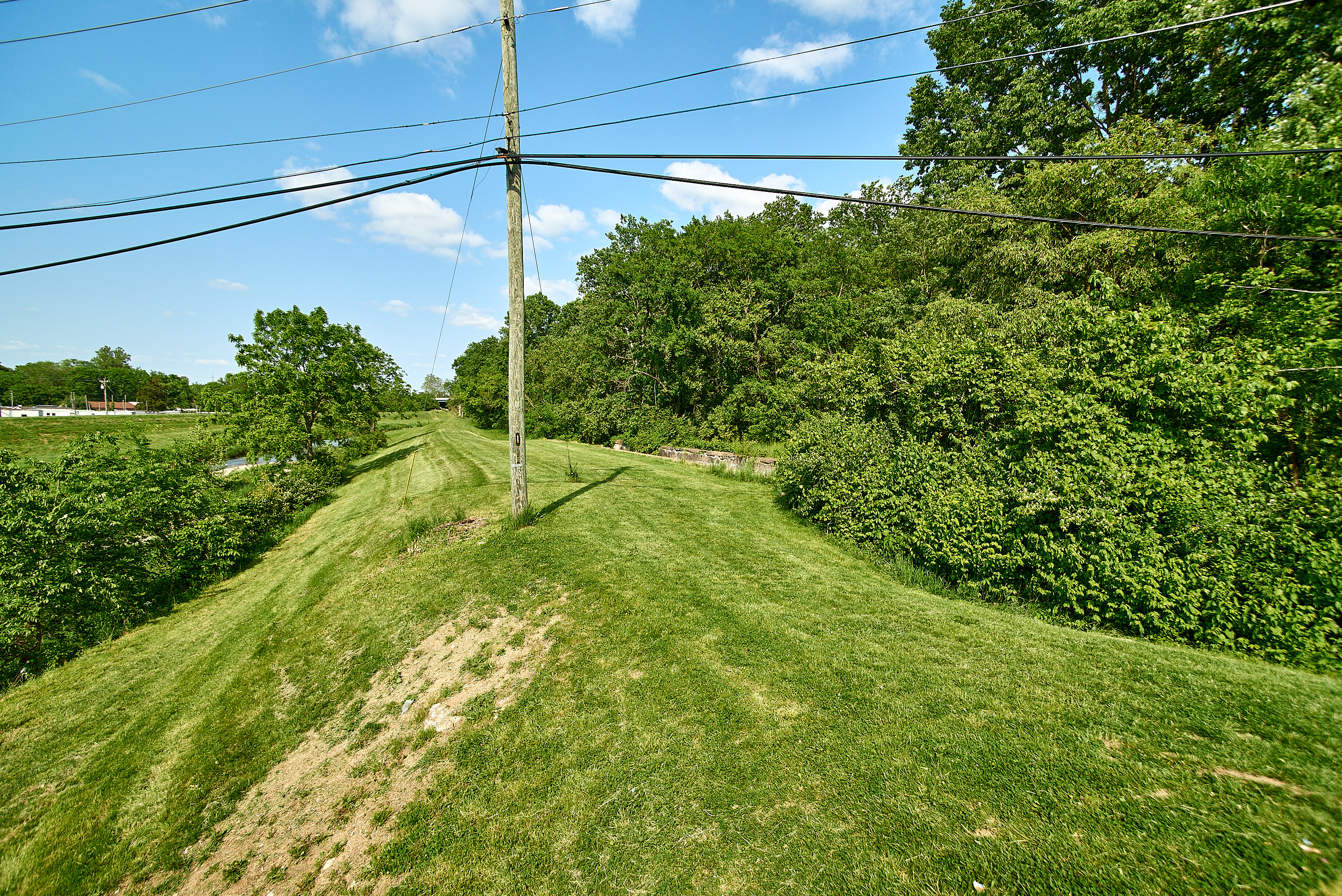 Miami & Erie Canal right-of-way and the Excello lock as seen from Main Street, looking east from the opposite side of the street as the last photo. Dick's Creek is at the left and the towpath berm has been raised to provide flood protection from the creek and Great Miami River.