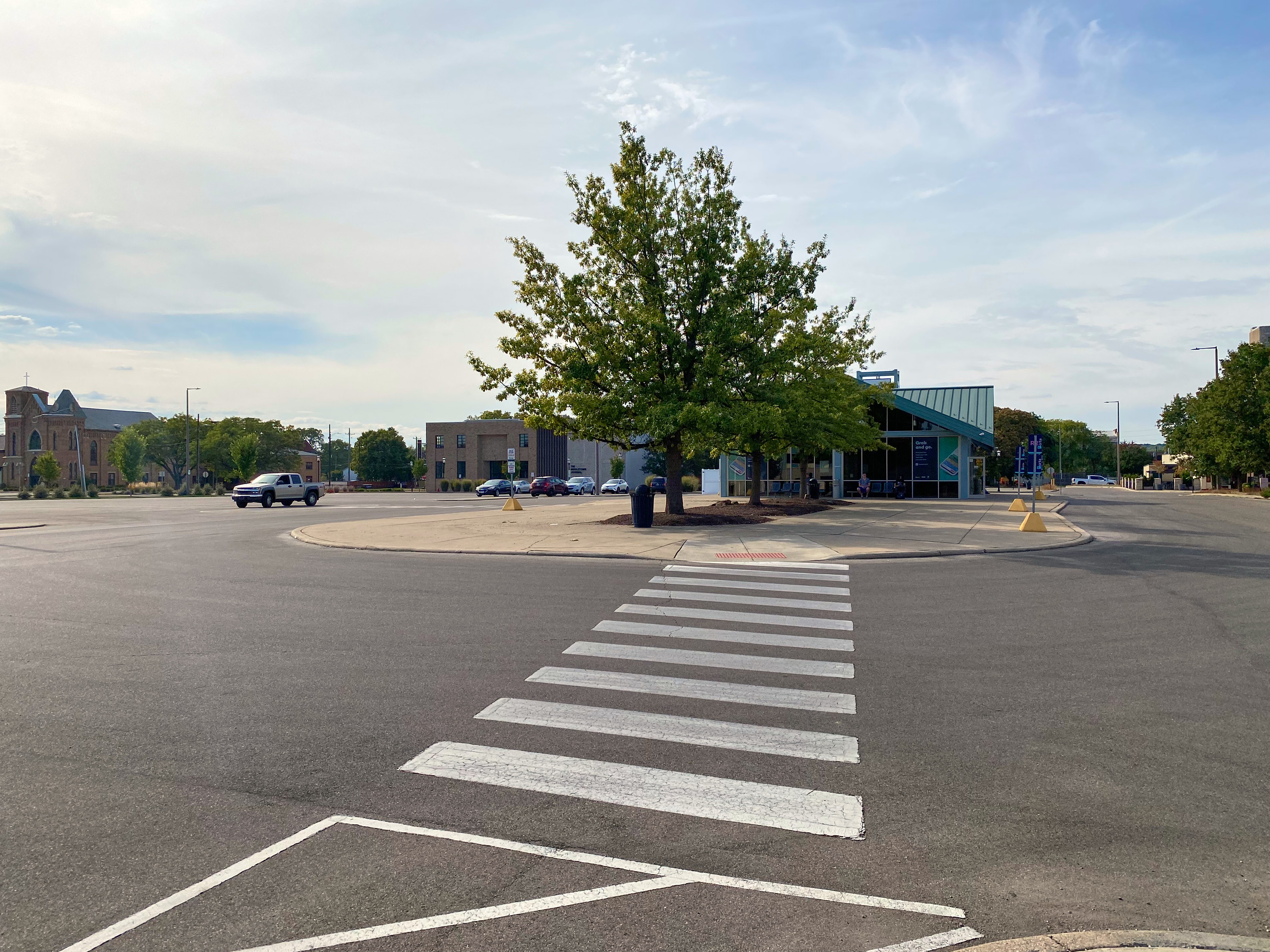 Location of the Miami & Erie Canal and Warren County Canal intersection at the Middletown Transit Station, looking west northwest from the side of Reynolds Avenue. The vantage point of the previous two photos is by the tree in the center. The Miami & Erie Canal ran left-to-right and the Warren County Canal came in from the bottom along the crosswalk.