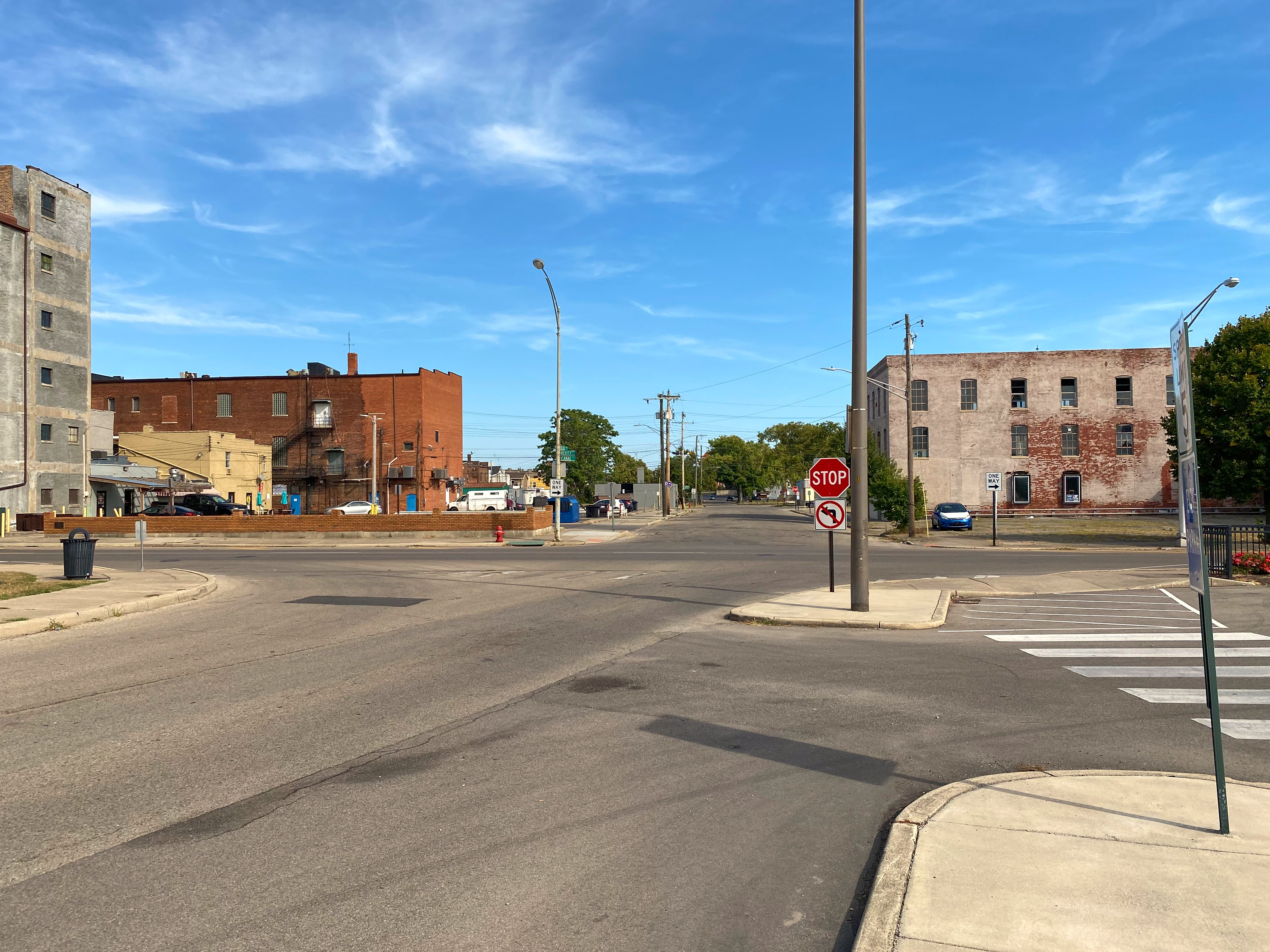 Route of the Warren County Canal in the center of Middletown, looking east southeast along Reynolds Avenue across Verity Parkway from the vantage point of the previous photo. Note the old industrial building at the right, and the rear of buildings on Central Avenue on the left.