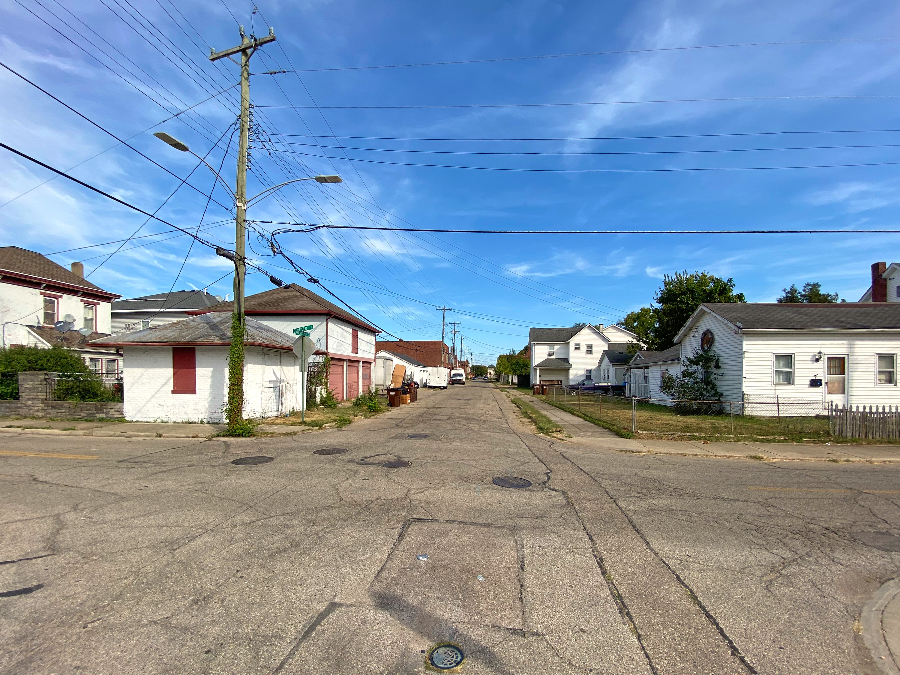 Route of the Warren County Canal in Middletown at Garfield and Philadelphia, looking east. Although this is a full street, it's treated more like an alley for buildings on Central Avenue to the left, most likely explained by the former presence of the canal.