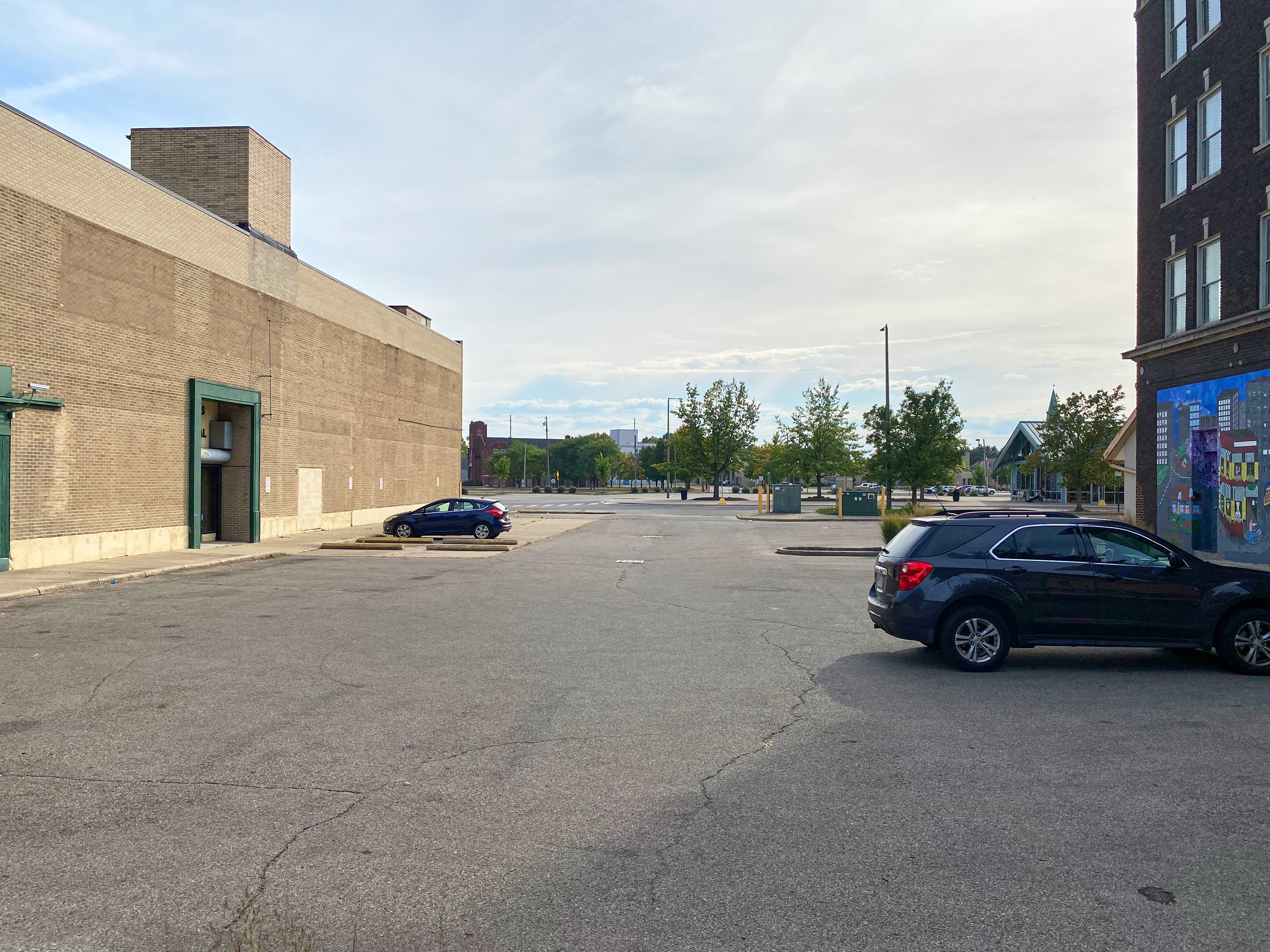 Current photo of the Miami & Erie Canal route from the previous photo, looking south from Central Avenue in Middletown. Note the details on the building at the right that match the previous photo.