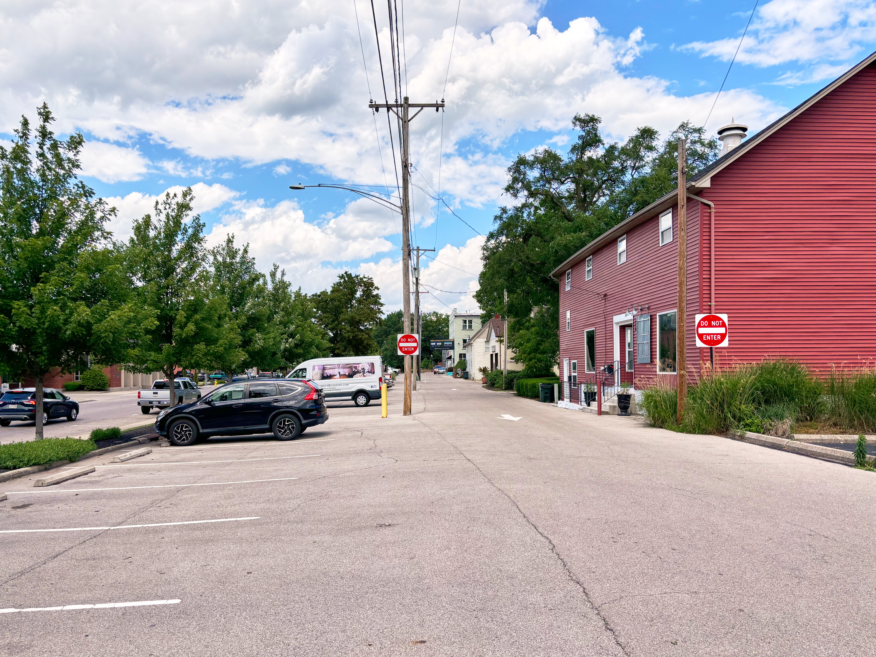 Miami & Erie Canal right-of-way and canal-era buildings at 1st and Linden in Miamisburg, looking north from the vantage point of the previous photo.