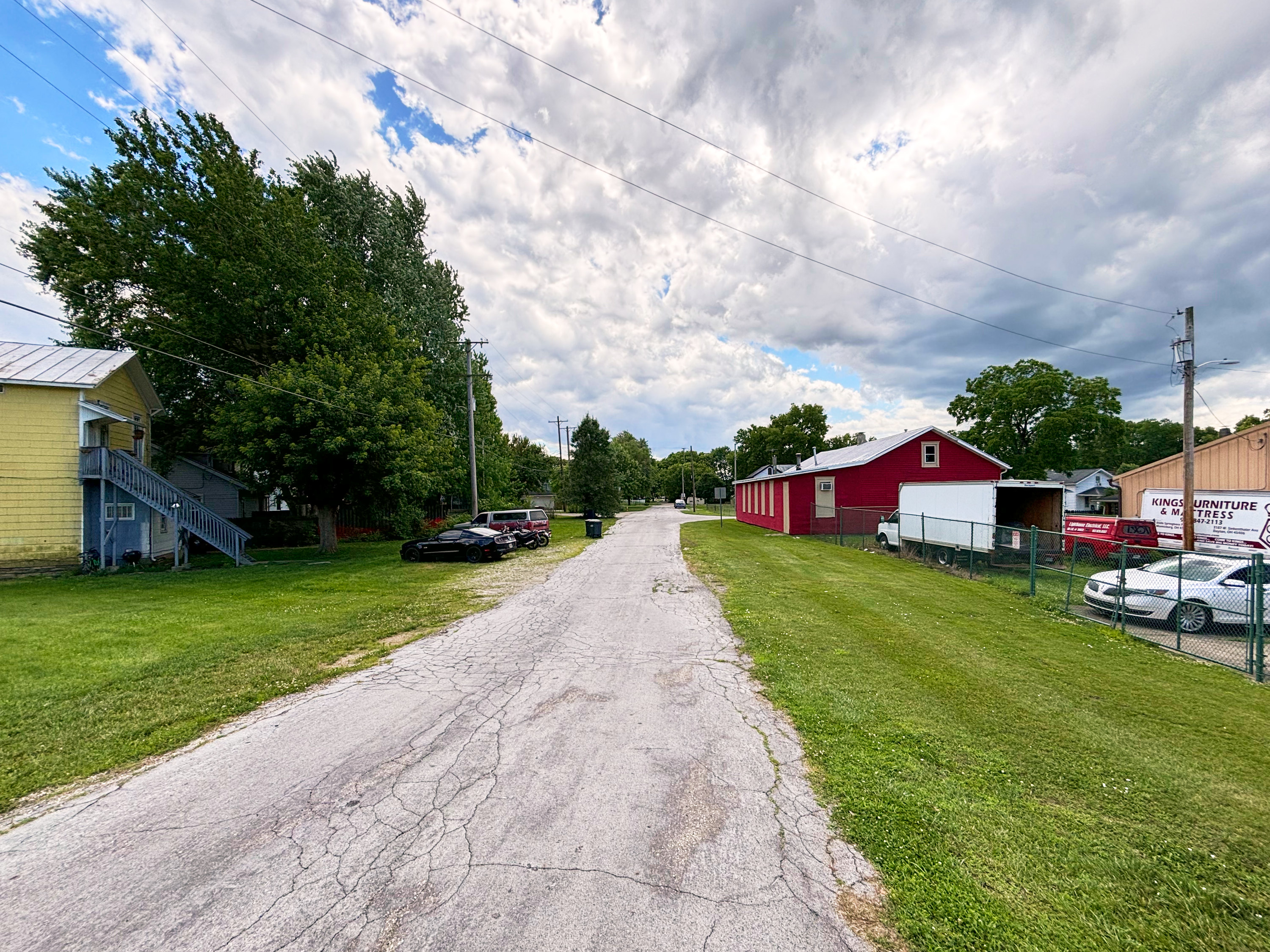 Miami & Erie Canal right-of-way on Canal Street in Miamisburg, looking southwest towards Gressbach Court and Sycamore Street.