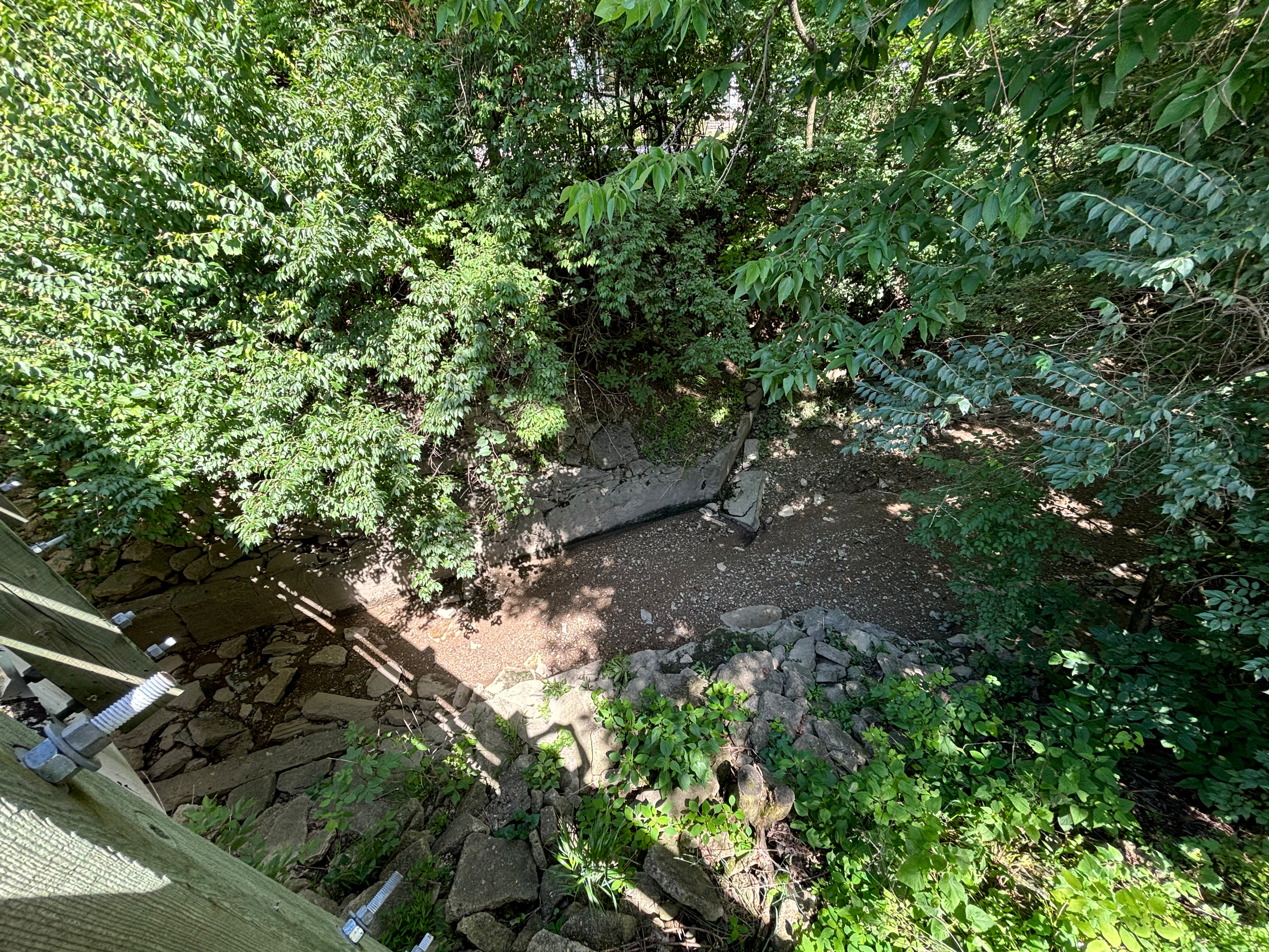 Miami & Erie Canal overflow channel under the Miamisburg & Carrollton Hydraulic near West Main and Weir Street in West Carrollton, looking east at the approach channel from atop the current bridge.