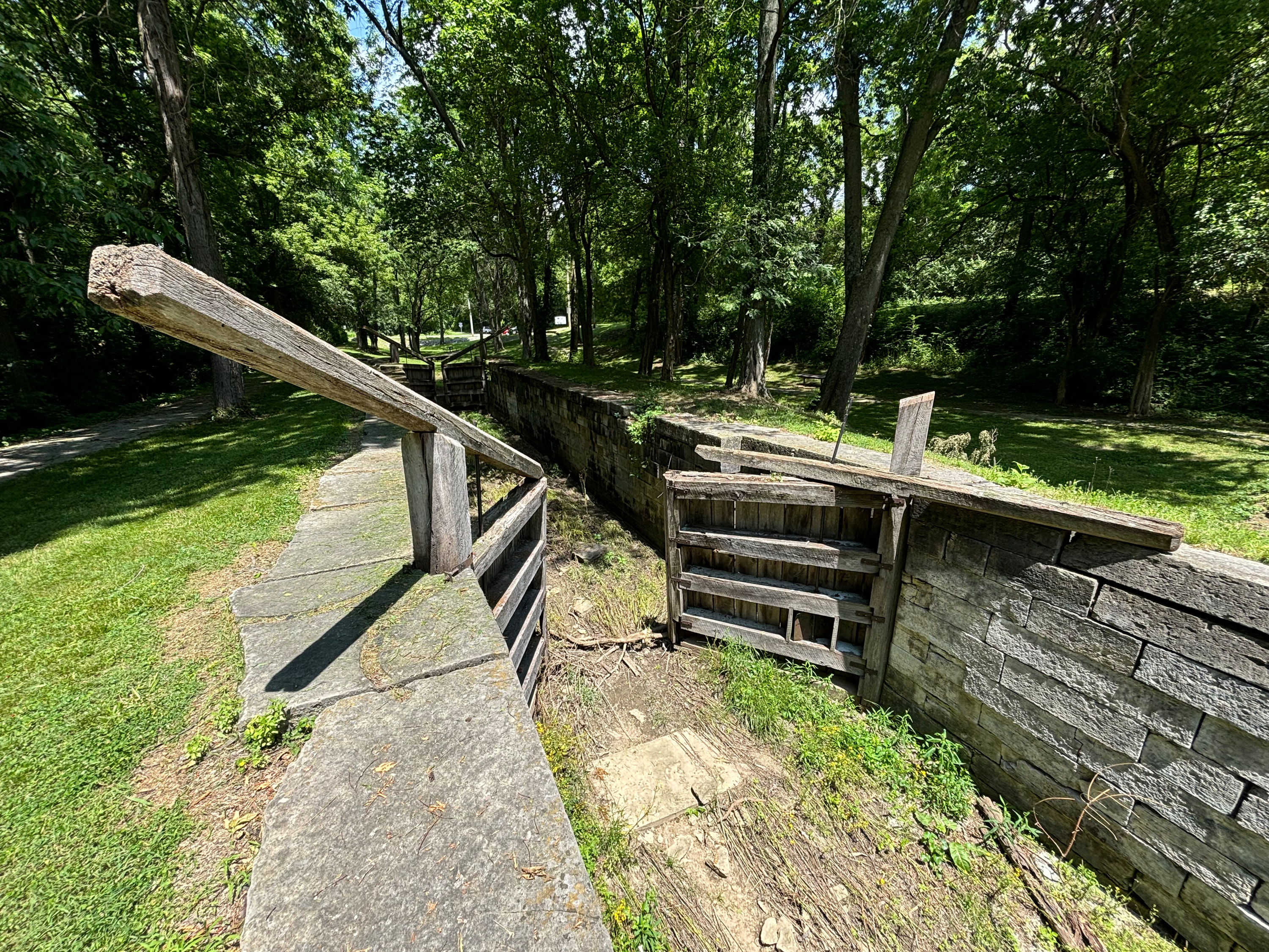 South end of Miami & Erie Canal lock #18 in Canal Lock Park in Huber Heights, looking north towards Endicott Road. The towpath is on the left.