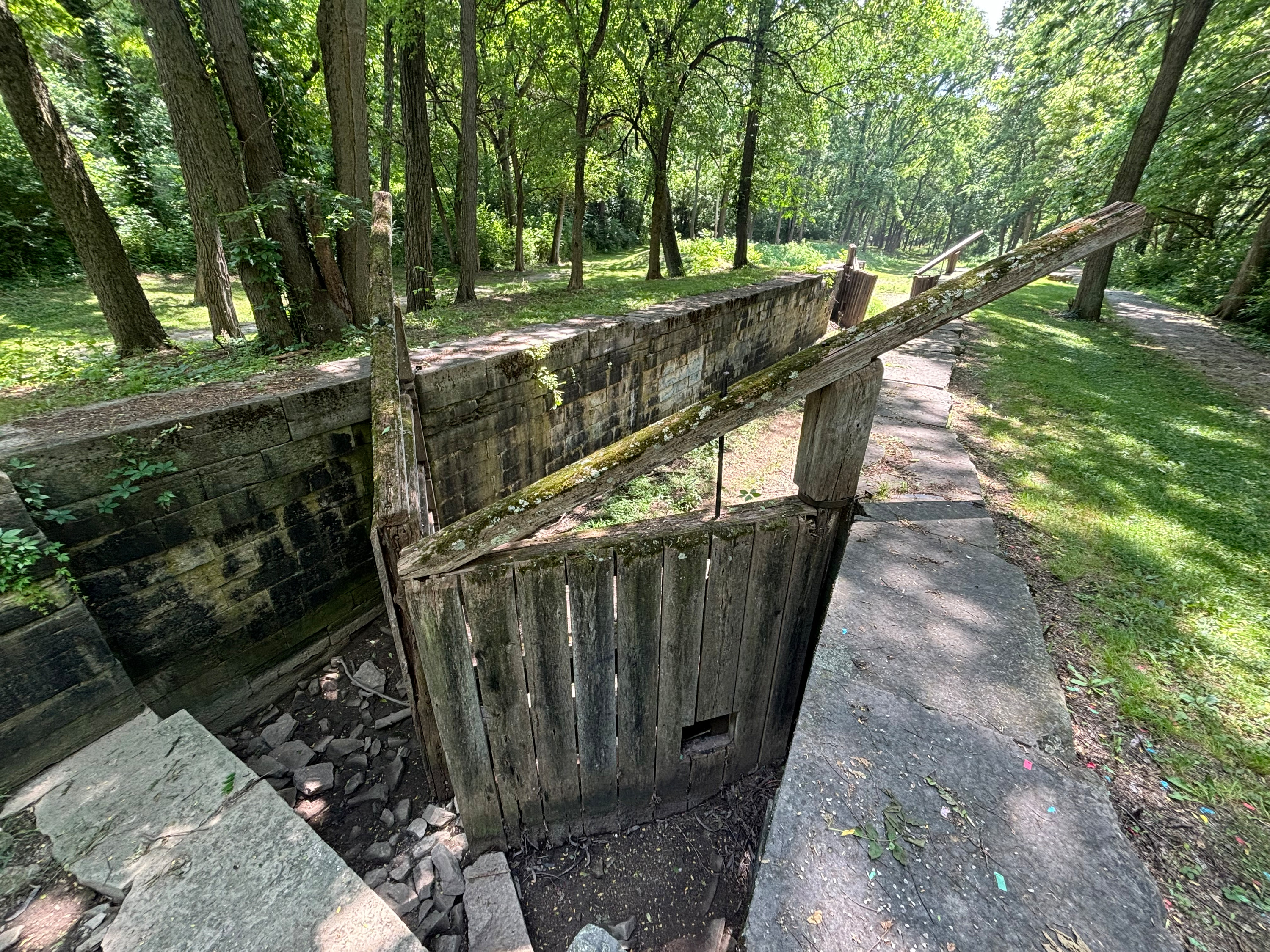 North end of Miami & Erie Canal lock #18 in Canal Lock Park in Huber Heights, looking southeast towards Endicott Road.