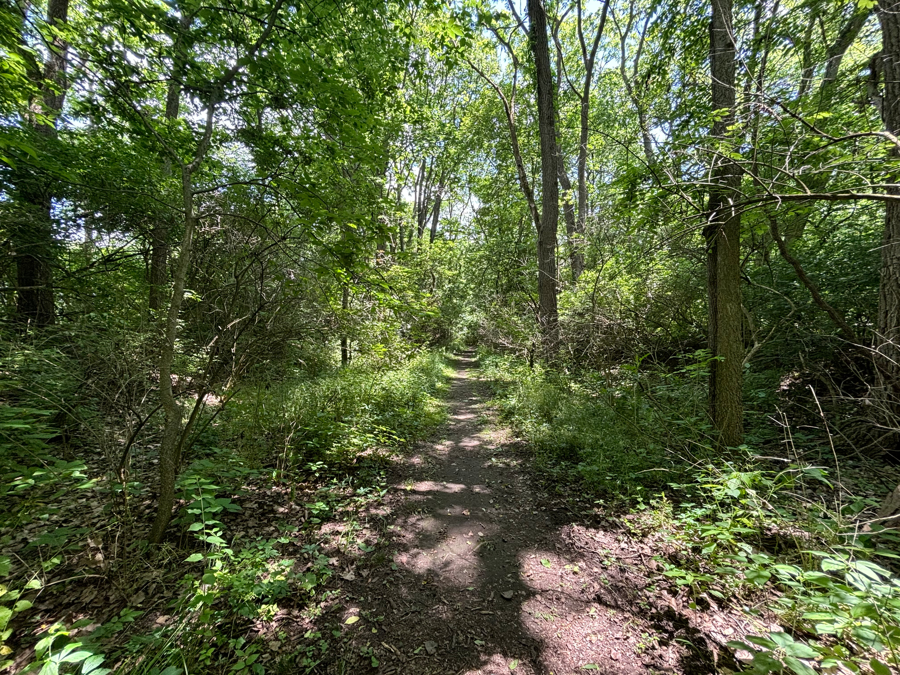 Miami & Erie Canal bed approaching the Taylorsville Dam and Great Miami River, looking east from near the Great Miami River Recreational Trail. The canal sat on a berm in the west floodplain of the river to maintain its elevation. This is a good 20 feet or so above the floodplain. This hiking path starts in the canal bed but after a short time drops out of the berm onto the floodplain floor to the north.