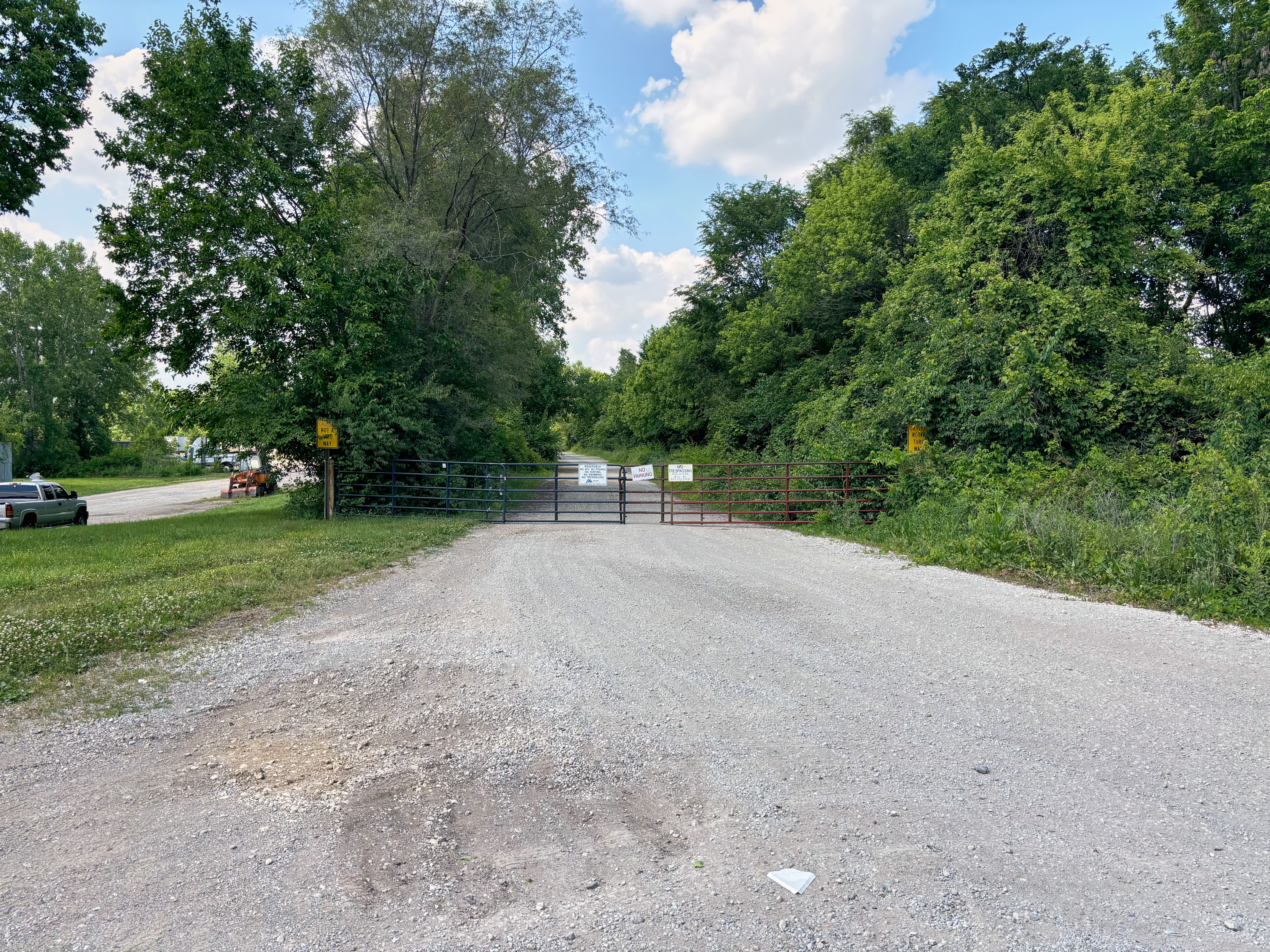 Miami & Erie Canal right-of-way on the other side of Dye Mill Road in Troy, looking north.